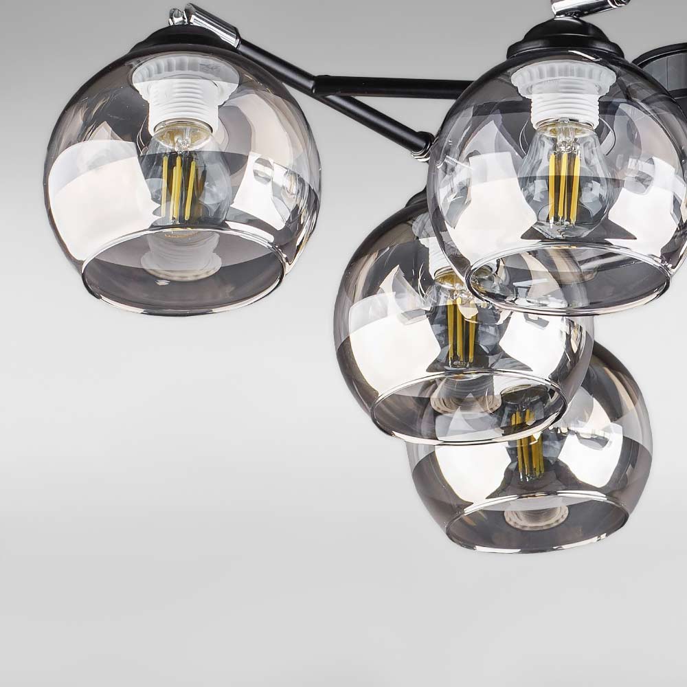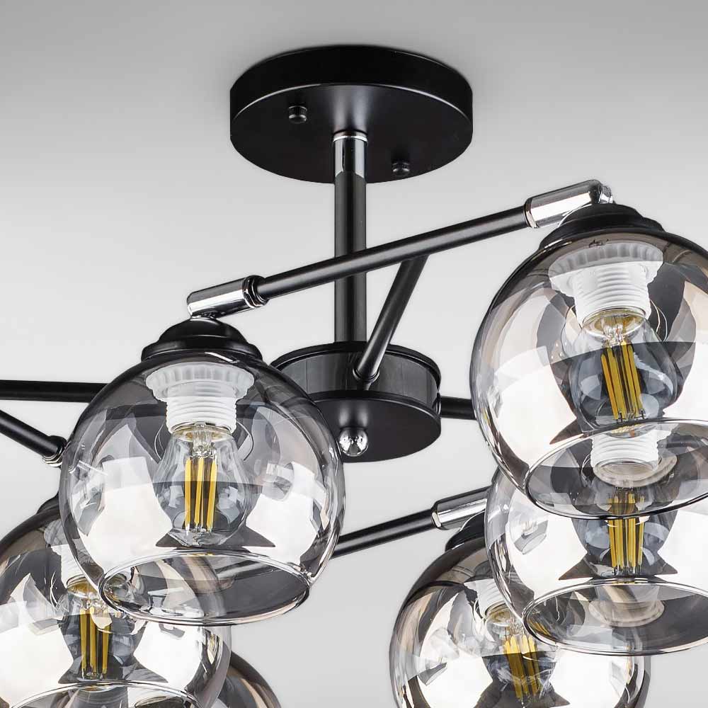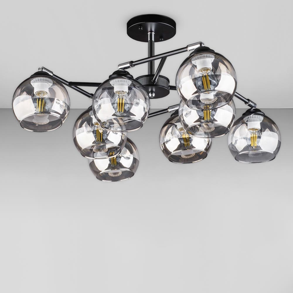 Стильна стельова люстра на вісім ламп зі скляними плафонами круглої форми.