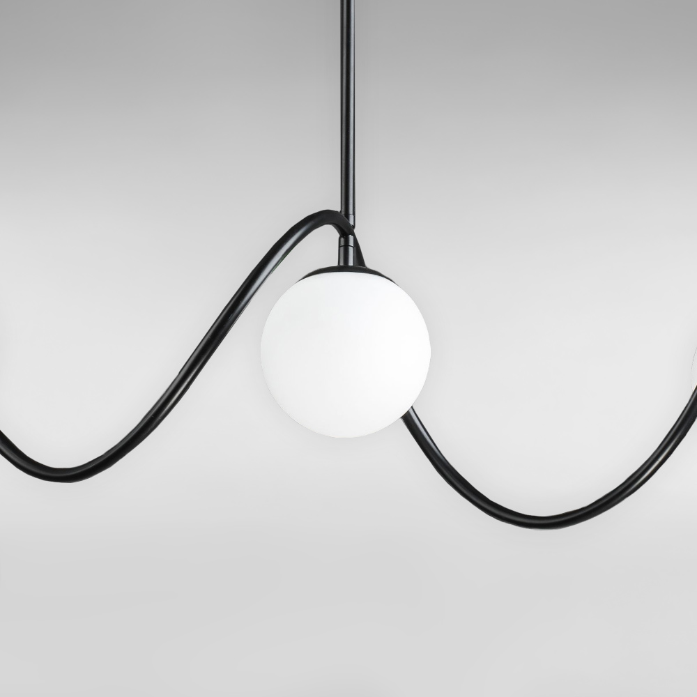 Сучасна стельова люстра на три лампи зі скляними плафонами форми кулі.