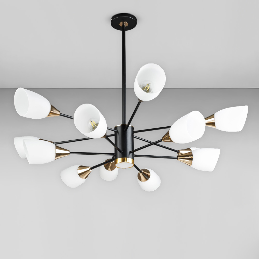 Сучасна стельова люстра на дванадцять ламп зі скляними конусними плафонами.
