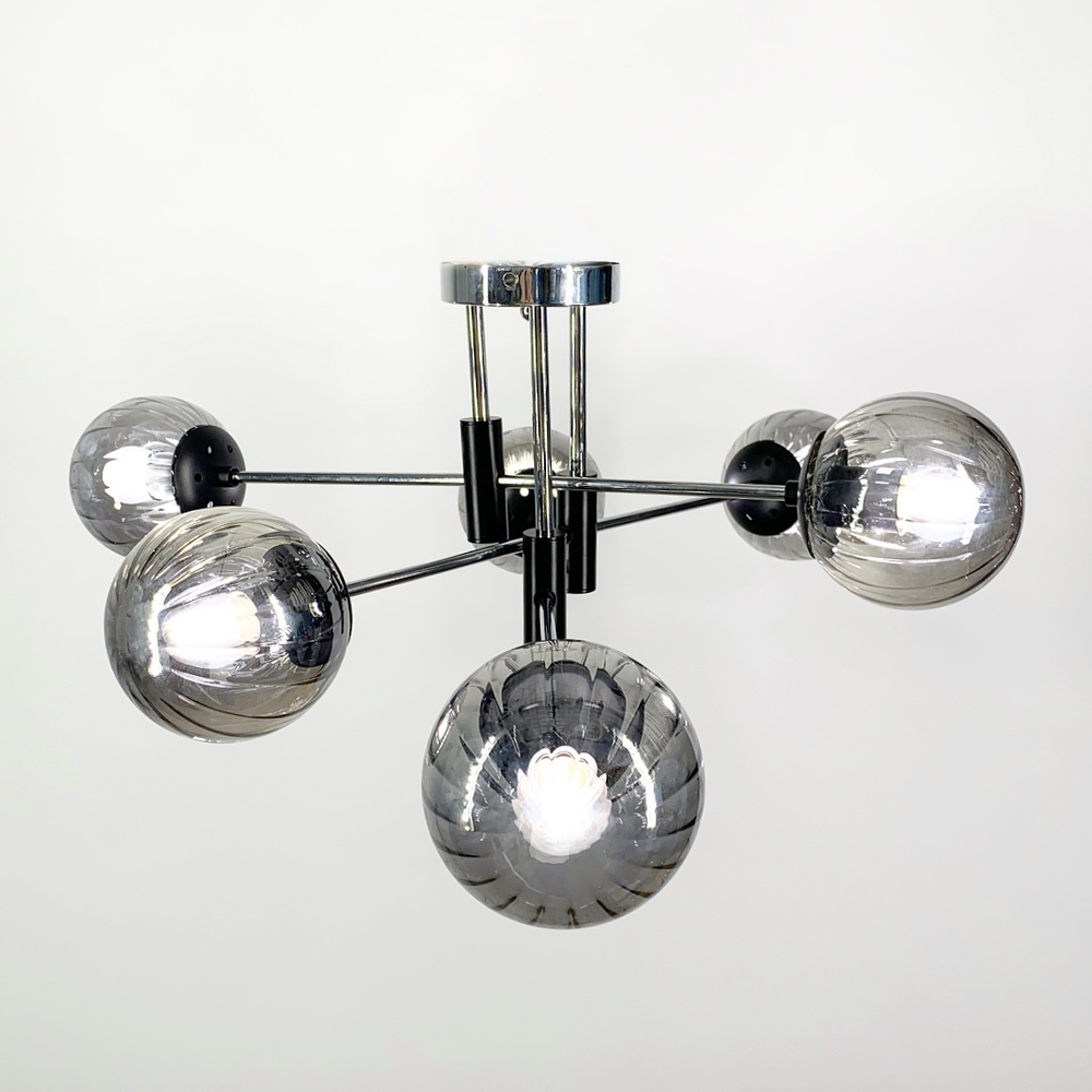 Стильна стельова люстра на 6 ламп з круглими кольоровими плафонами - графіт. Найкраще використовувати у приміщенні із загальною площею 18 м. кв., при використанні лампочок 6 Вт (LED) або 60 Вт (стандартна).
