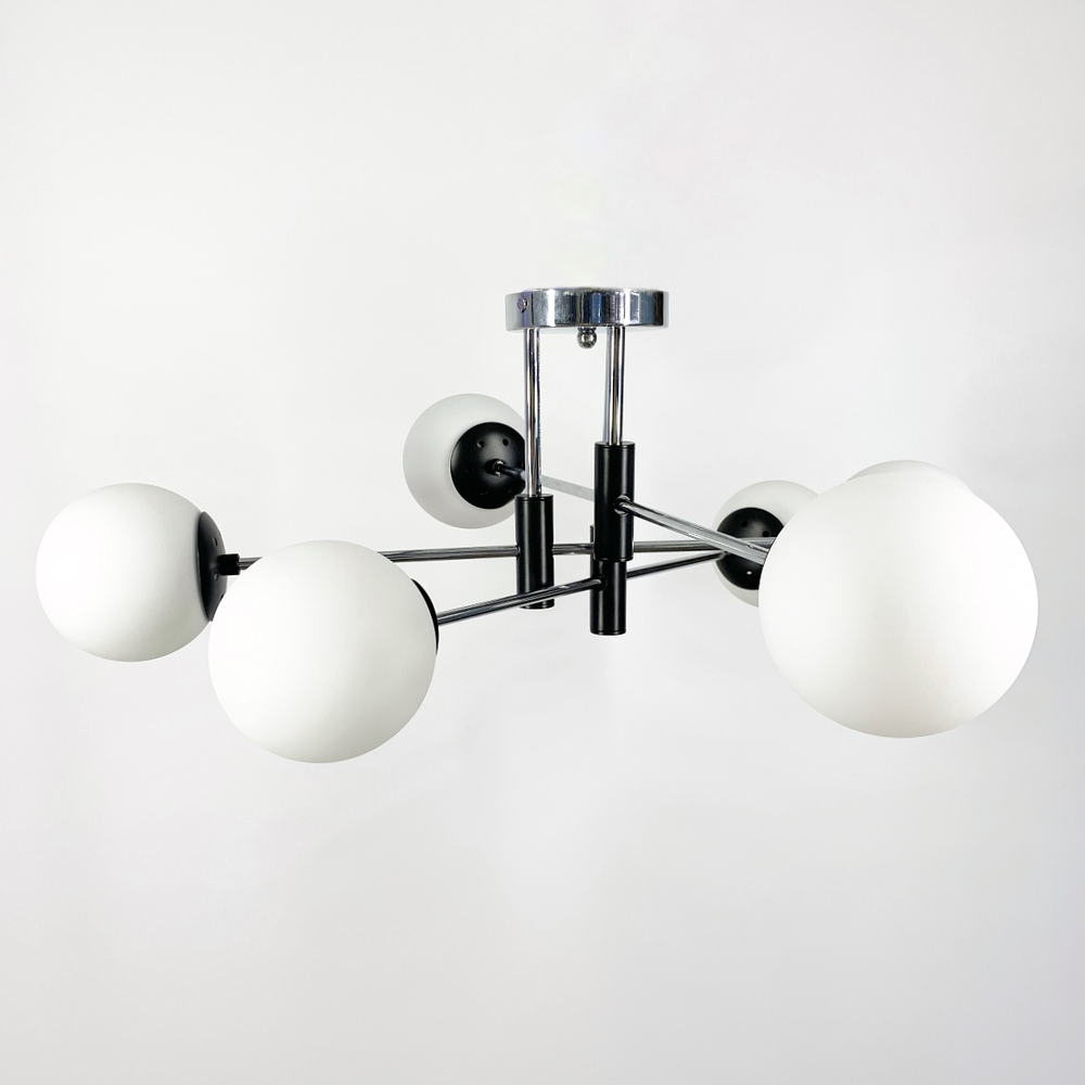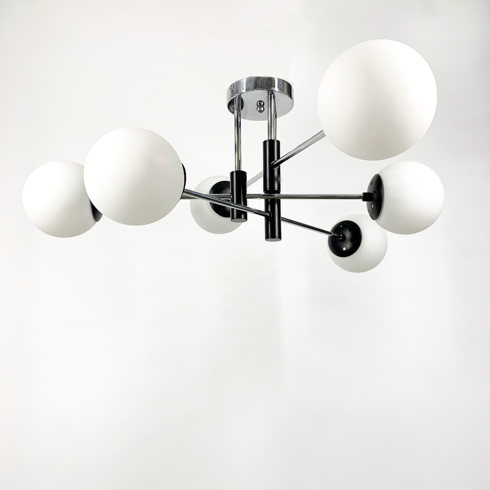 Стильна стельова люстра на 6 ламп із круглими плафонами білого кольору. Найкраще використовувати у приміщенні із загальною площею 18 м. кв., при використанні лампочок 6 Вт (LED) або 60 Вт (стандартна).