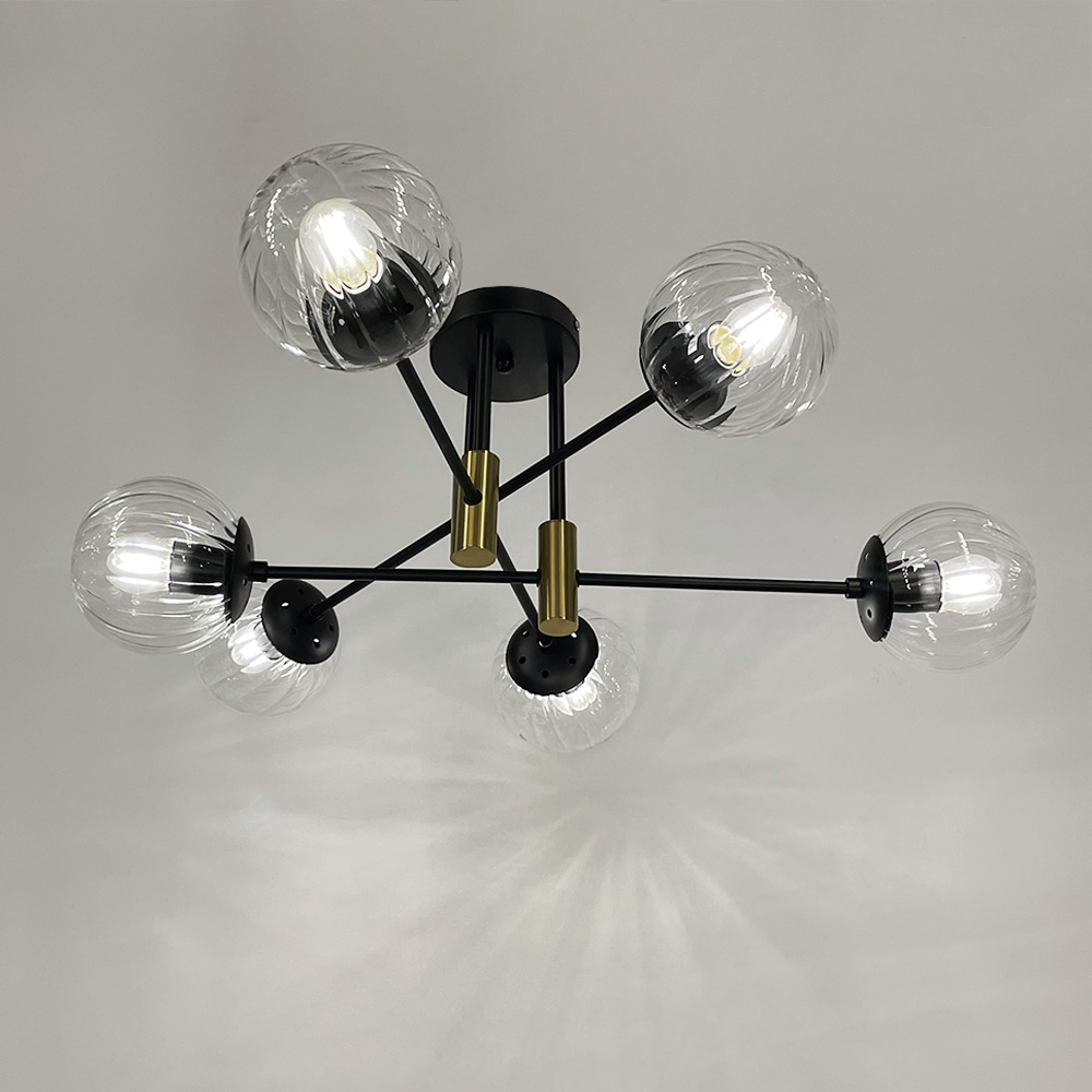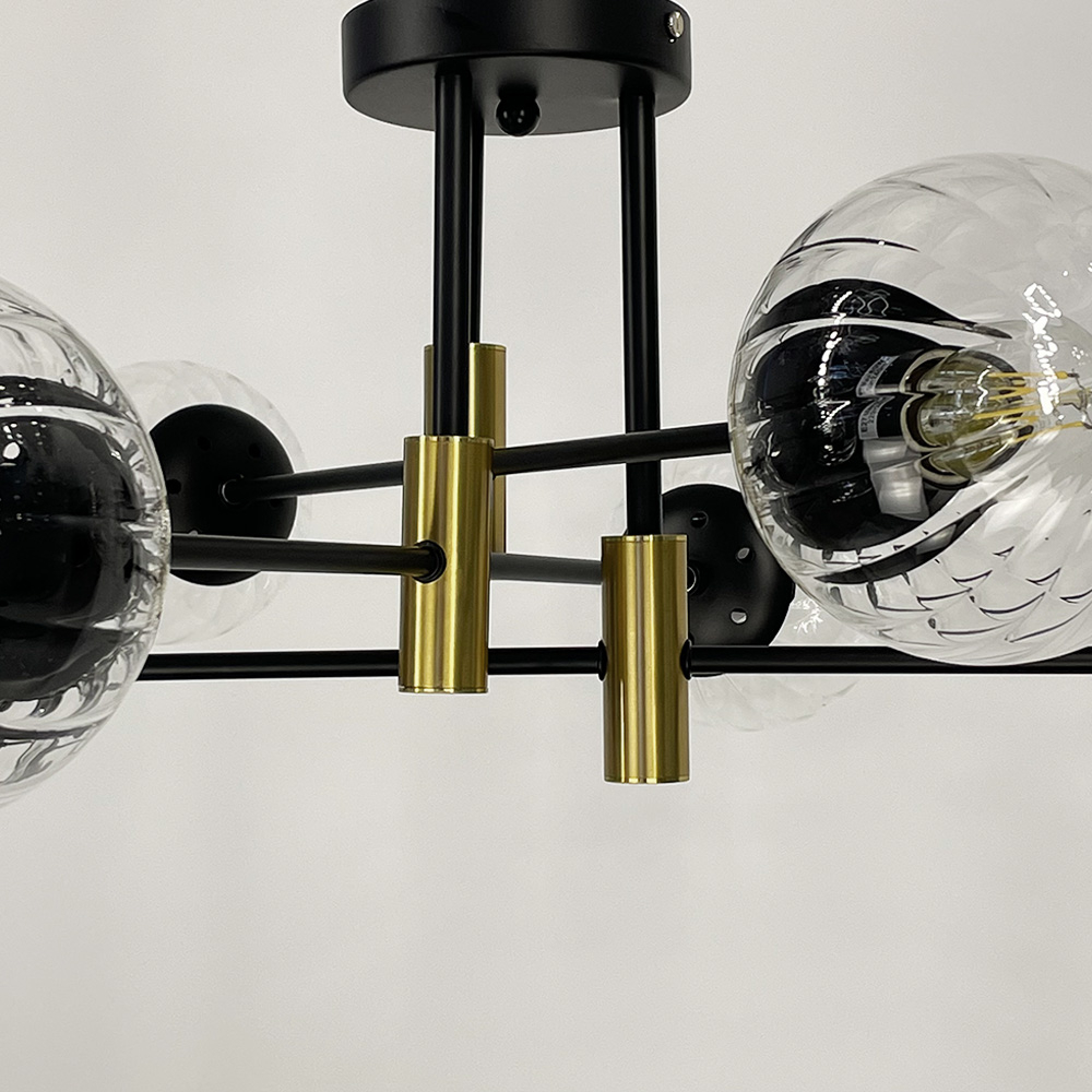 Стельова люстра у чорному металевому корпусі на 6 прозорих плафонів з латунною фурнітурою. Діаметр люстри – 70 см. Висота (відступ від стелі) – 25 см. Найкраще використовувати в приміщенні із загальною площею 18 м. кв.