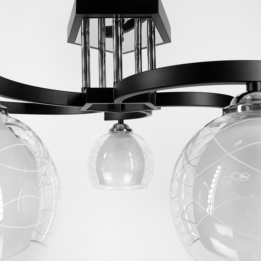 Стельові люстри на п'ять ламп з відкритими подвійними плафонами (прозорий + матовий) в чорному металевому корпусі з хромовою фурнітурою.