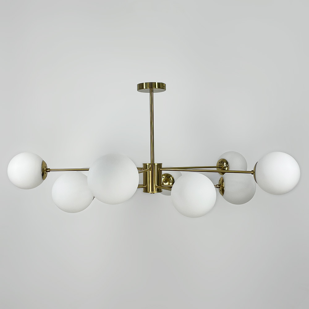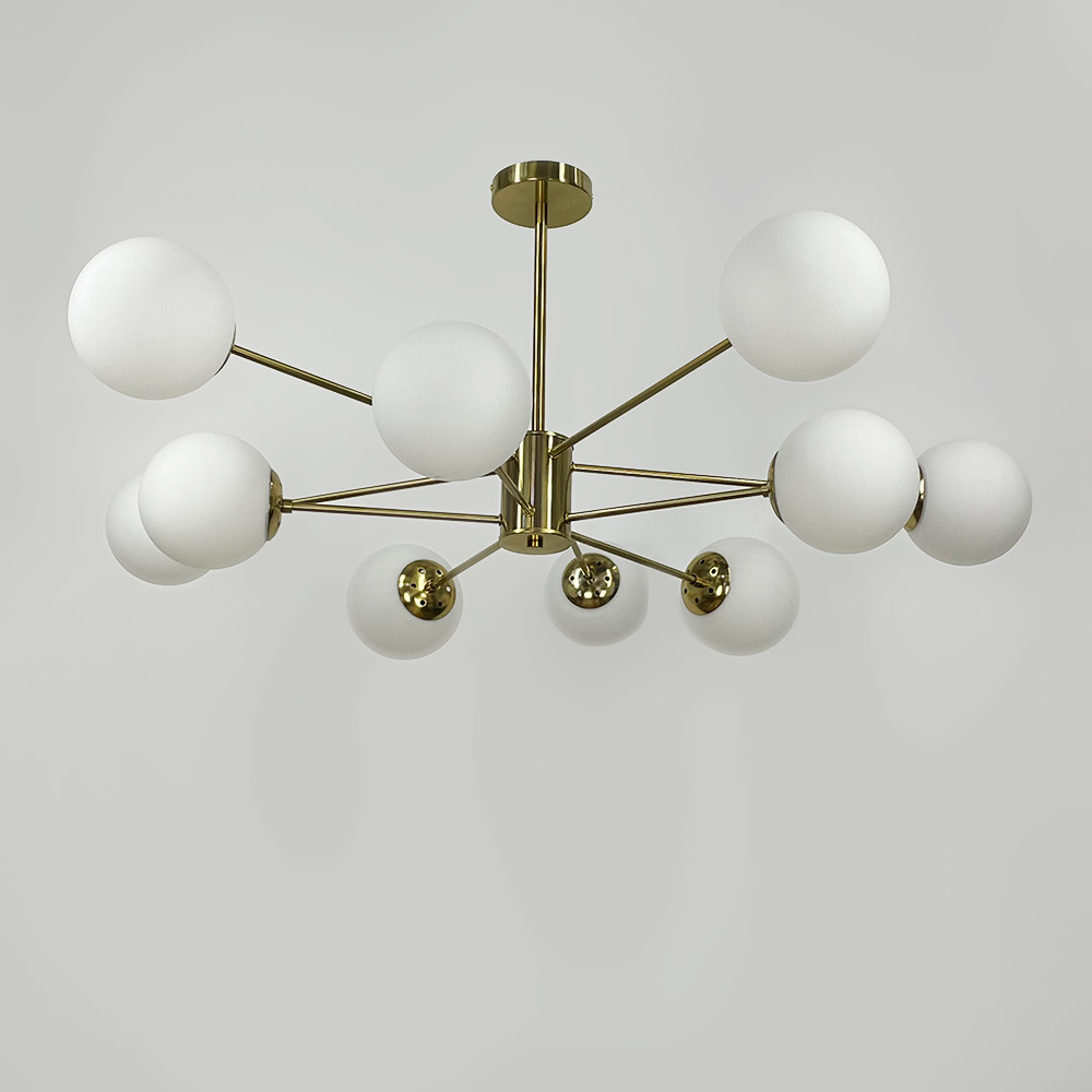 Стельова люстра-молекула на 10 ламп зі скляними плафонами-кулями.Найкраще використовувати у приміщенні із загальною площею 30 м2, при використанні лампочок 6 Вт (LED).