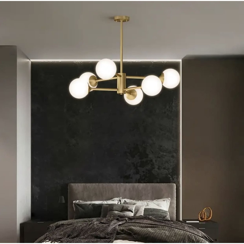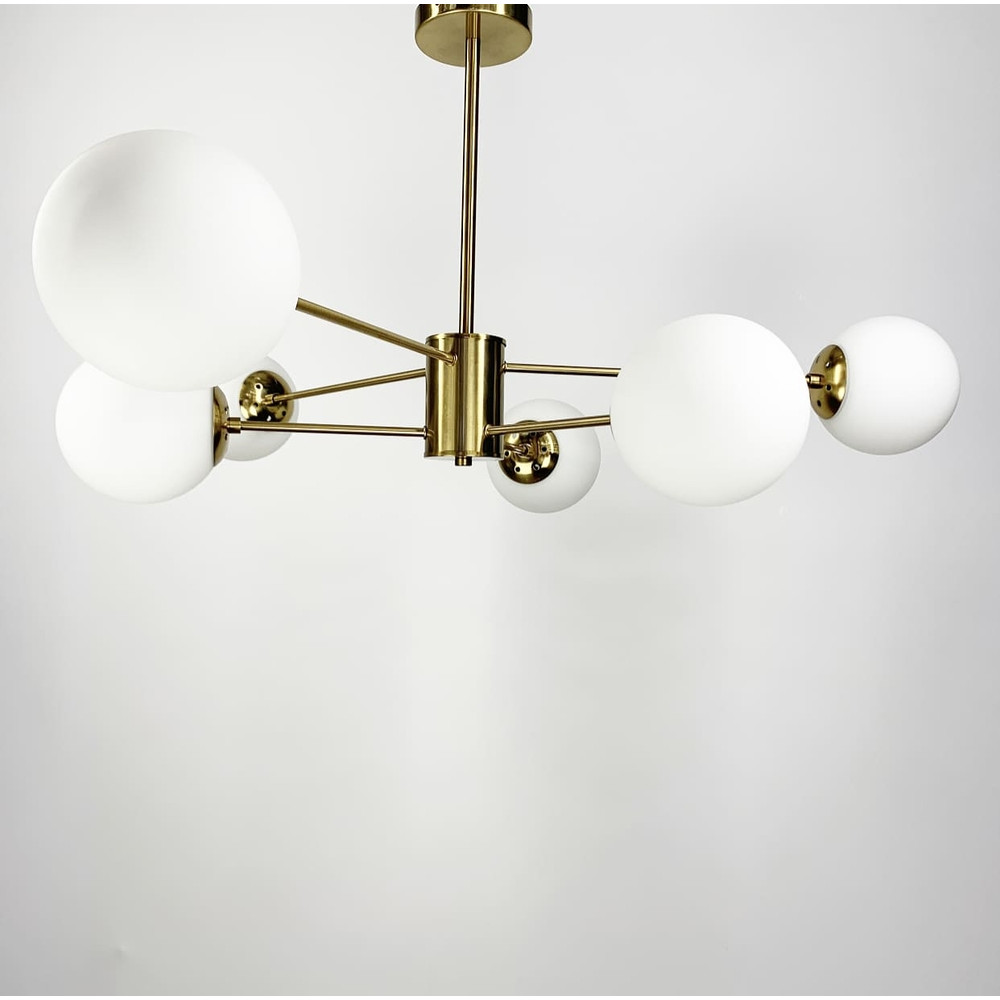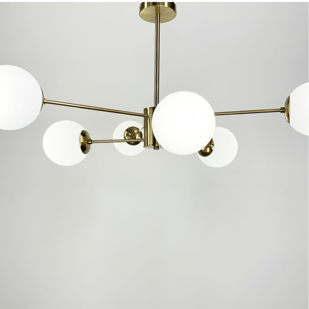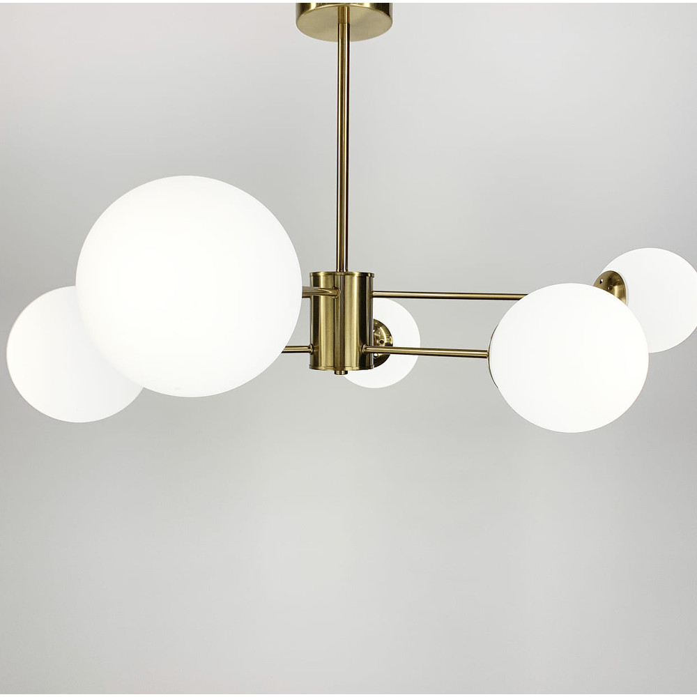 Стильна стельова люстра на шість ламп зі скляними білими матовими плафонами у формі кулі.