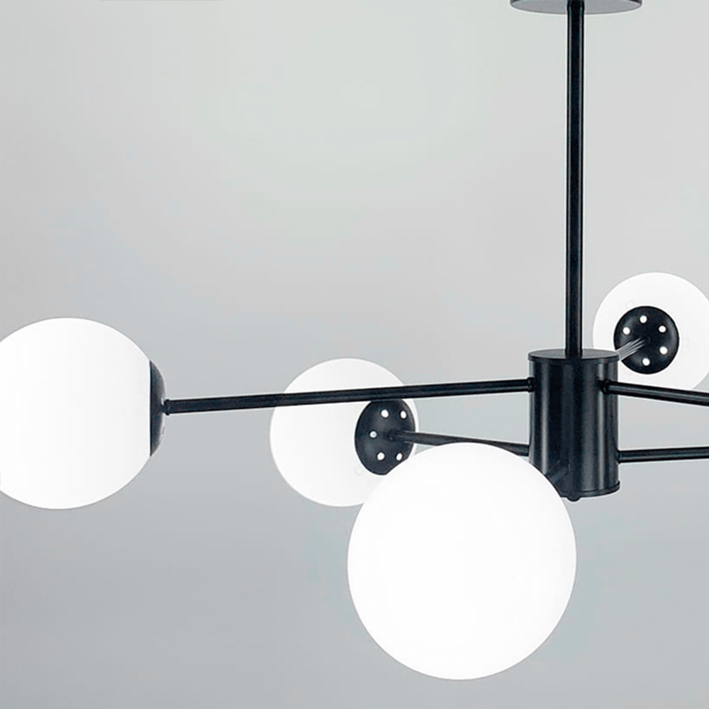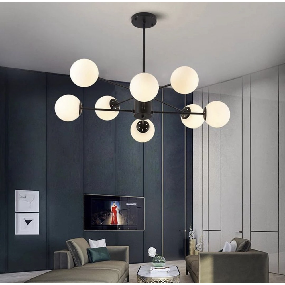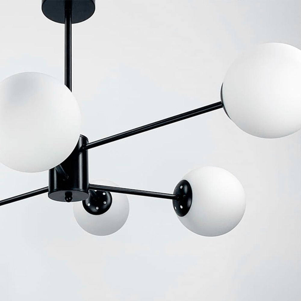 Стильна стельова люстра молекули на вісім ламп зі скляними білими матовими плафонами форми кулі.