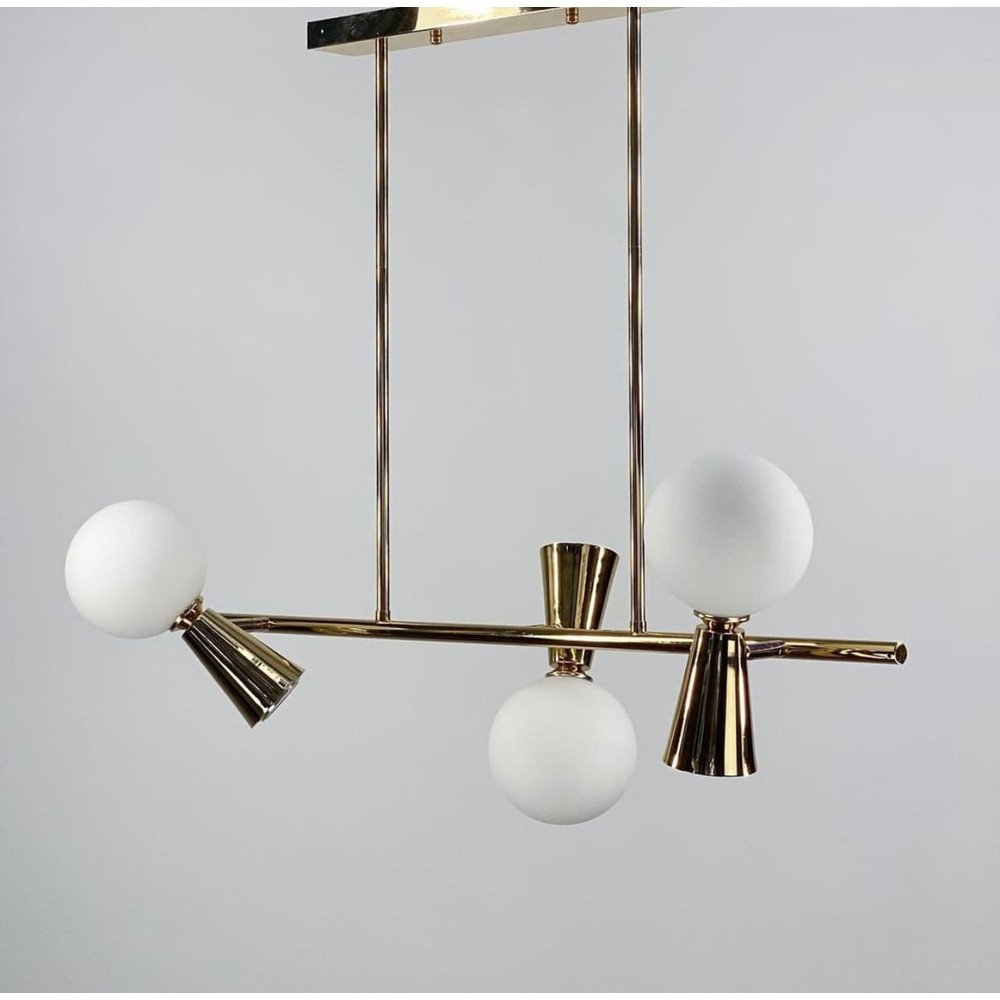 Люстра подовжена в золотому металевому корпусі з трьома плафонами на два джерела світла: скляна плафон-куля (білого кольору) з цоколем G9 – 3 шт та металевий плафон у вигляді споту (конусоподібний) з цоколем GU10 – 3 шт. Однією з переваг цих світильників є регулюючий механізм на основі кріплення плафона.