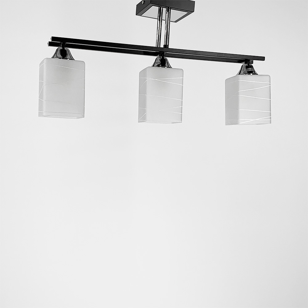 Стельова люстра на три лампи зі скляними плафонами з візерунком. Корпус – метал чорного кольору із фурнітурою хром. Найкраще використовувати у приміщенні із загальною площею 9 м. кв., при використанні лампочок 6 Вт (LED) або 60 Вт (стандартна).
