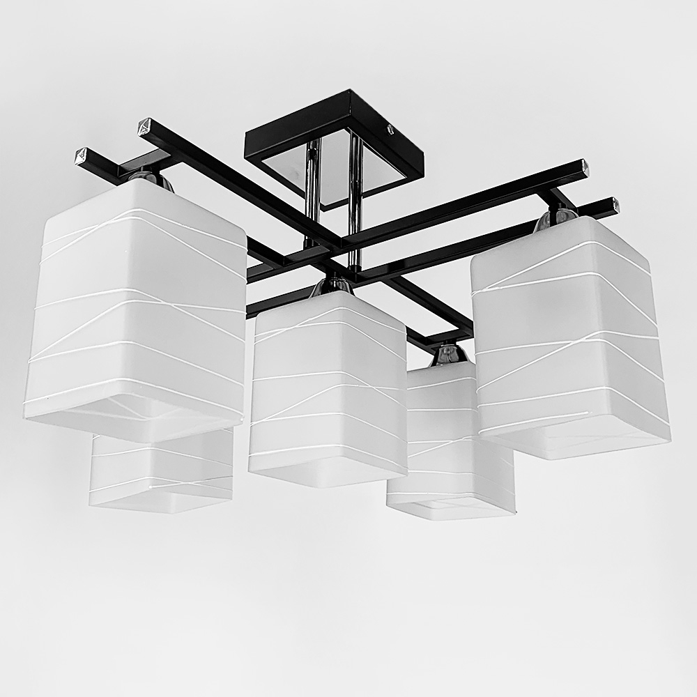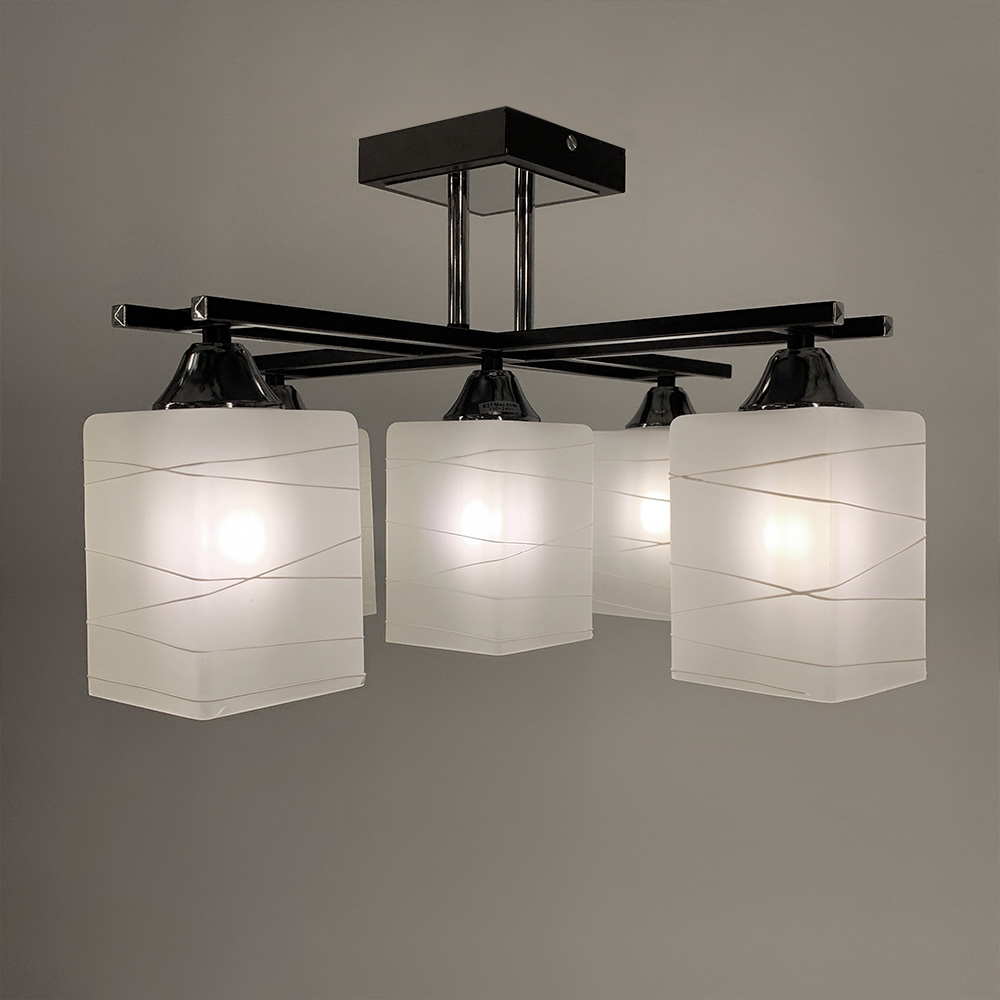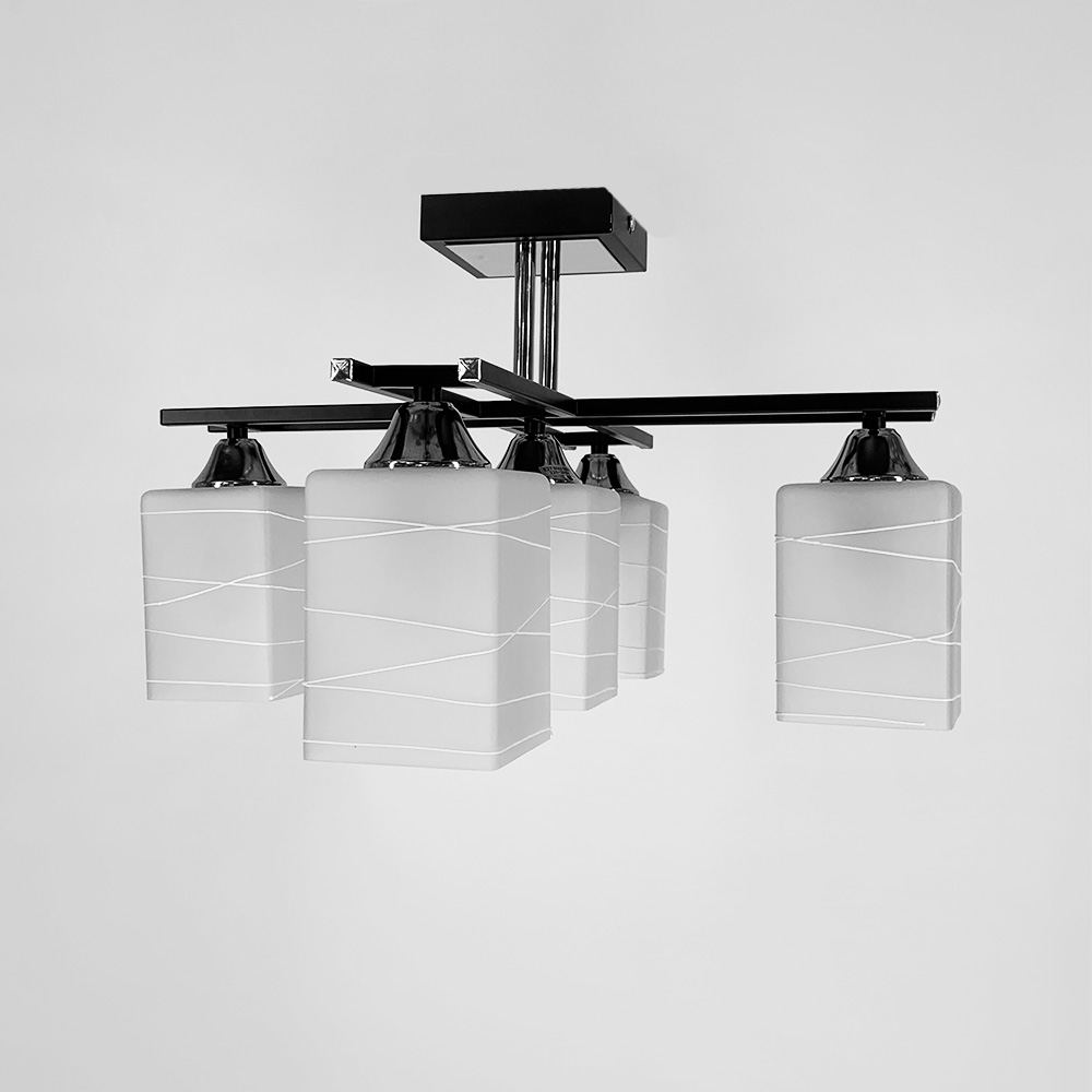 Стельова люстра на п'ять ламп зі скляними плафонами з візерунком. Корпус – метал чорного кольору із фурнітурою хром. Найкраще використовувати у приміщенні із загальною площею 15 м. кв., при використанні лампочок 6 Вт (LED) або 60 Вт (стандартна).