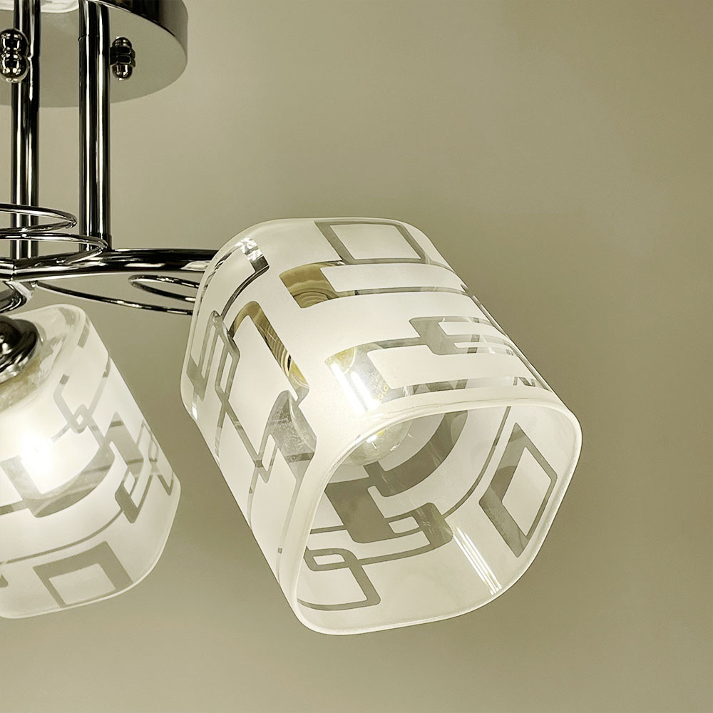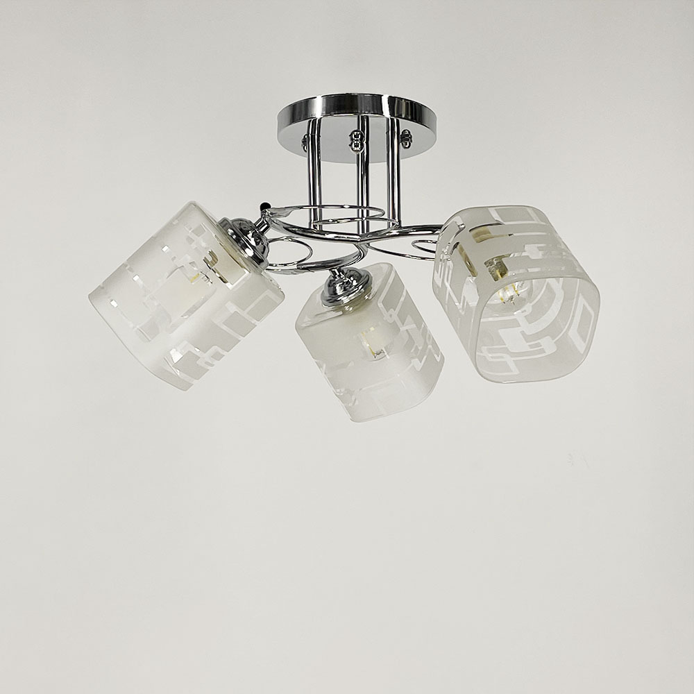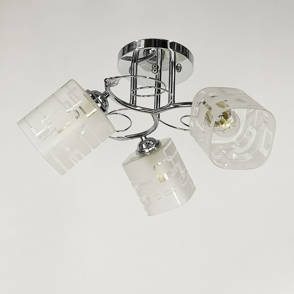 Стельова люстра на три лампи зі скляними плафонами з візерунками. Найкраще використовувати у приміщенні із загальною площею 9 м. кв., при використанні лампочок 6 Вт (LED) або 60 Вт (стандартна).