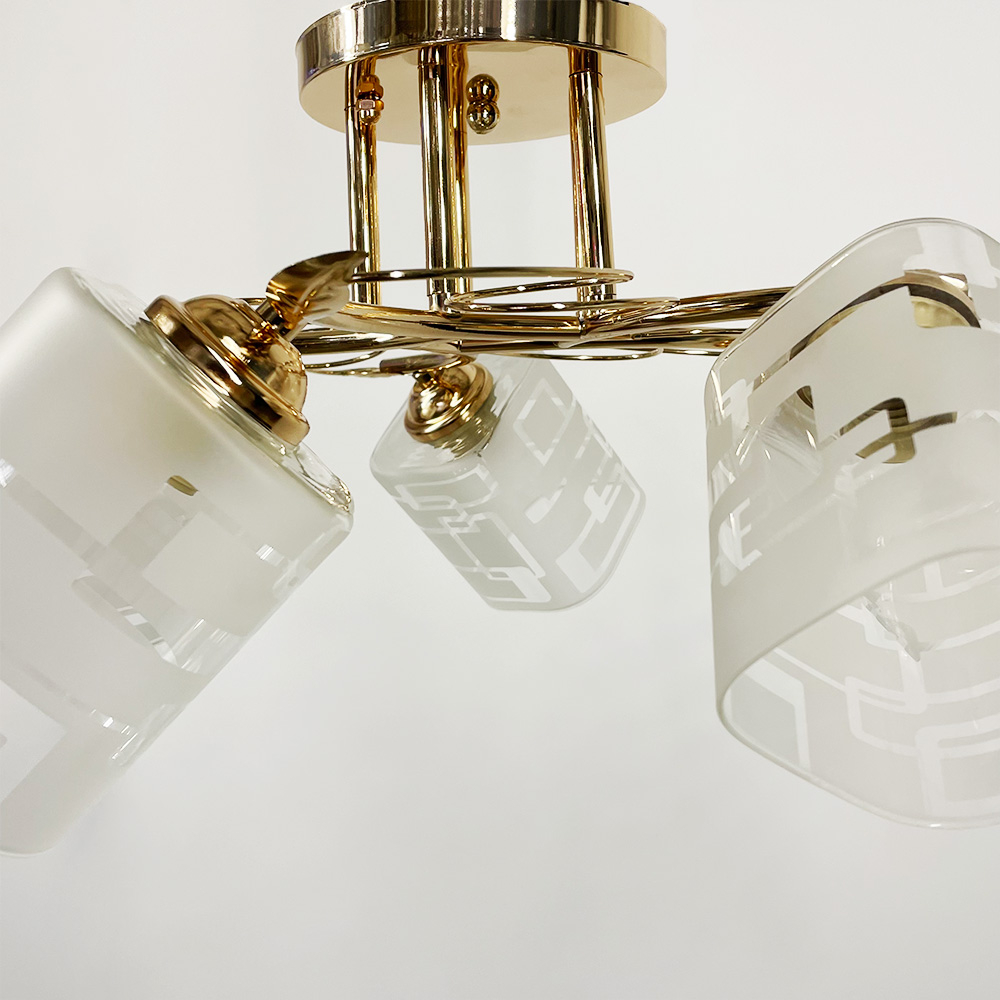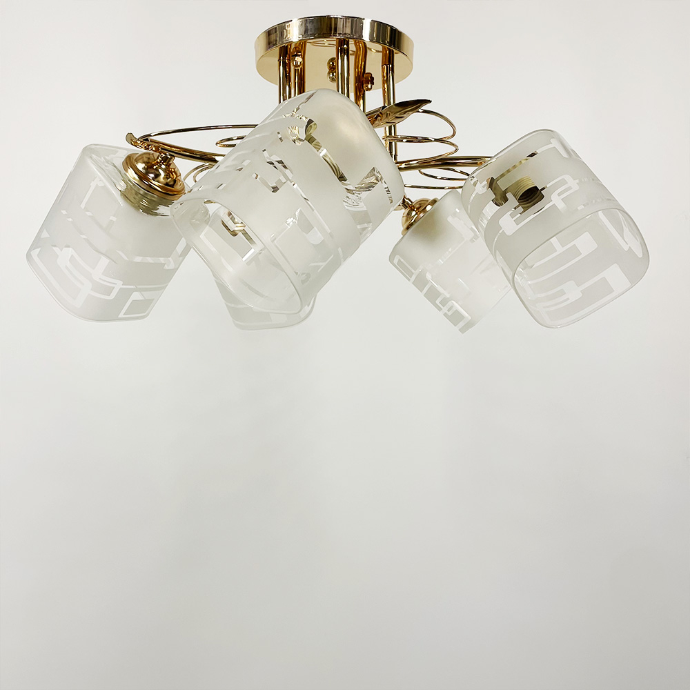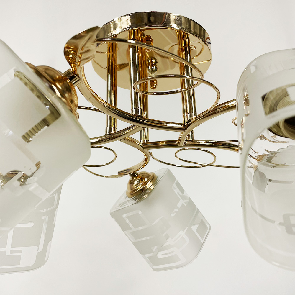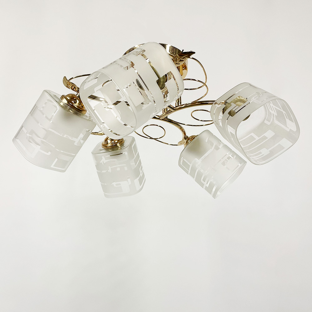 Стельова люстра на п'ять ламп зі скляними плафонами з візерунками. Найкраще використовувати у приміщенні із загальною площею 15 м. кв., при використанні лампочок 6 Вт (LED) або 60 Вт (стандартна).