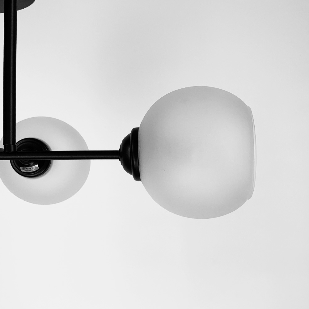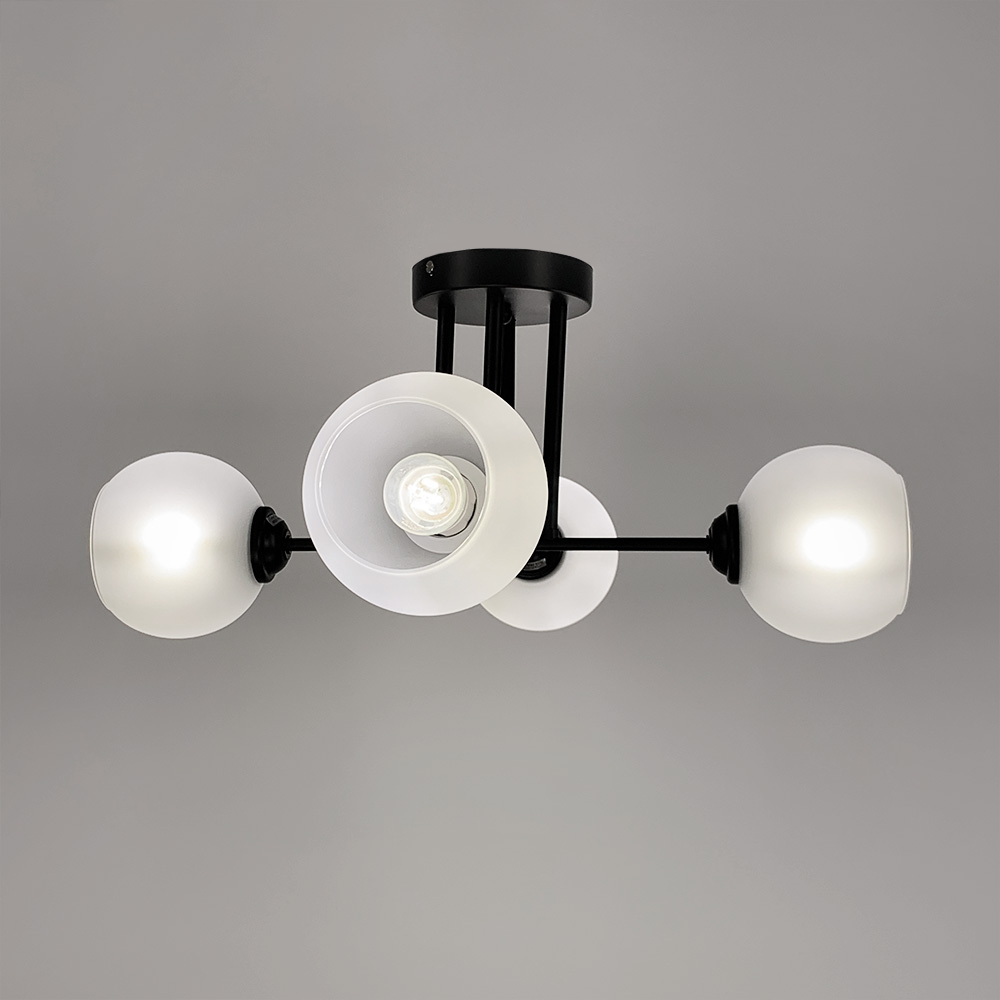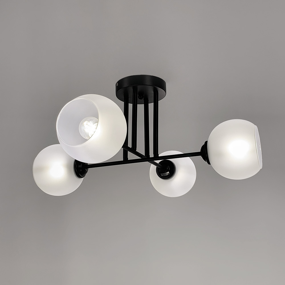 Стильна стельова люстра на чотири лампи із скляними плафонами круглої форми.