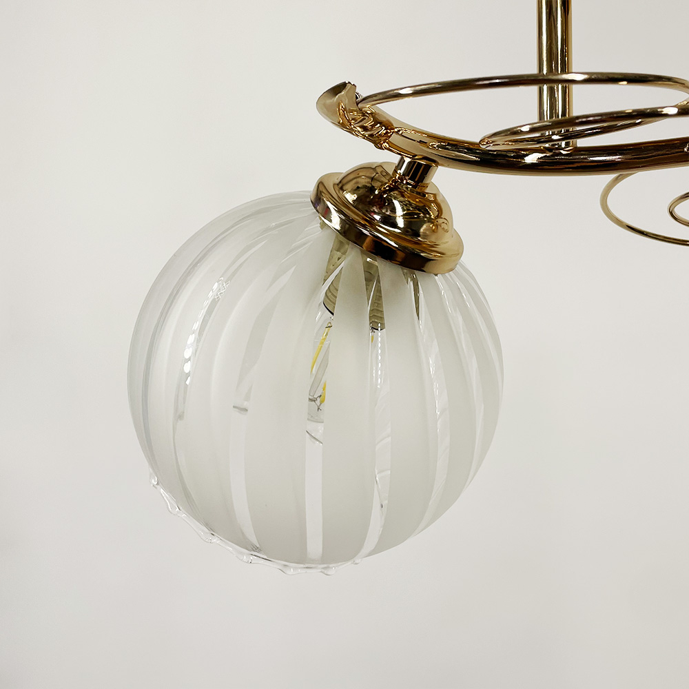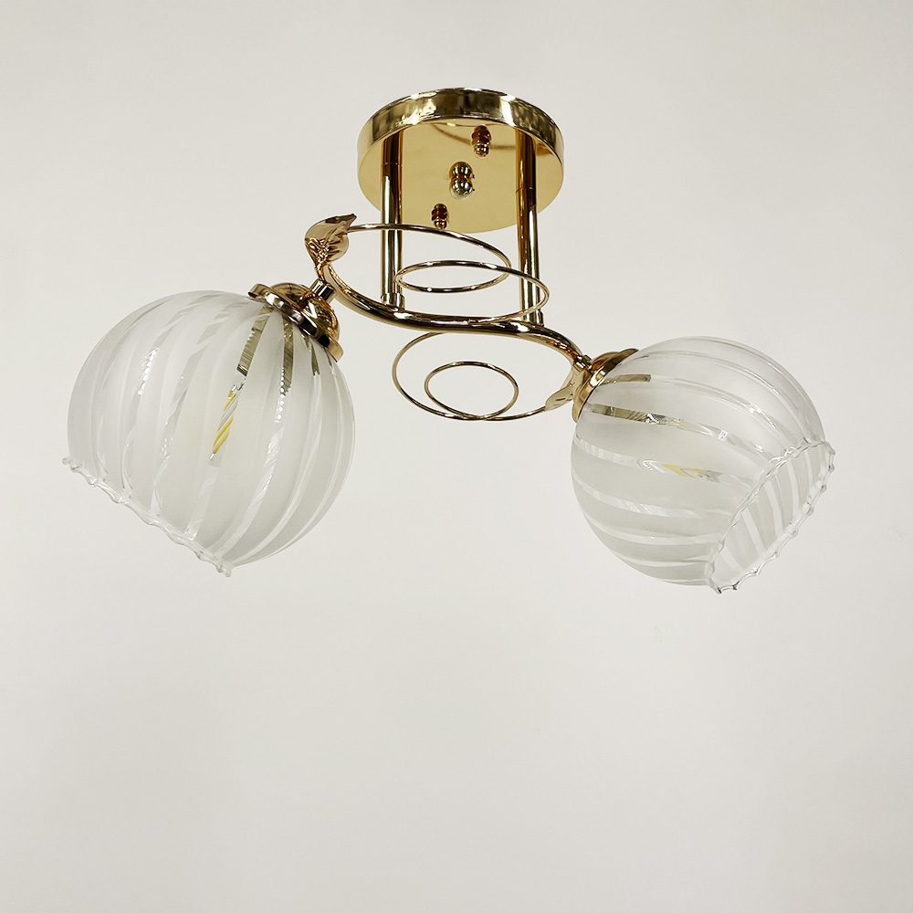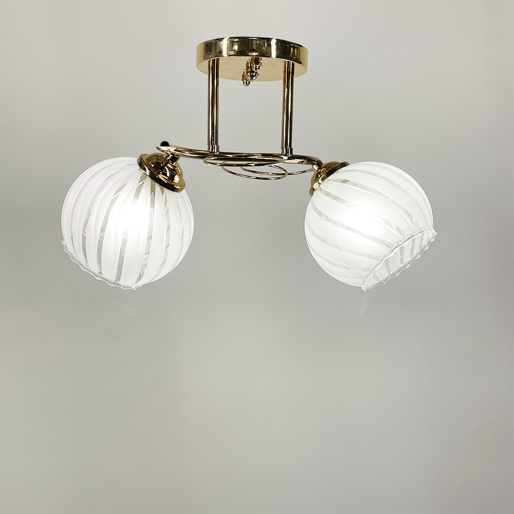 Стильна стельова люстра на дві лампи із скляними плафонами круглої форми.