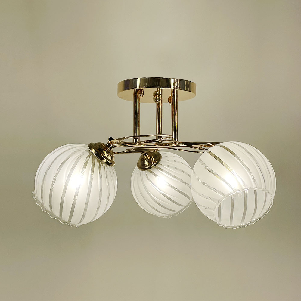 Стильна стельова люстра на три лампи зі скляними плафонами круглої форми.