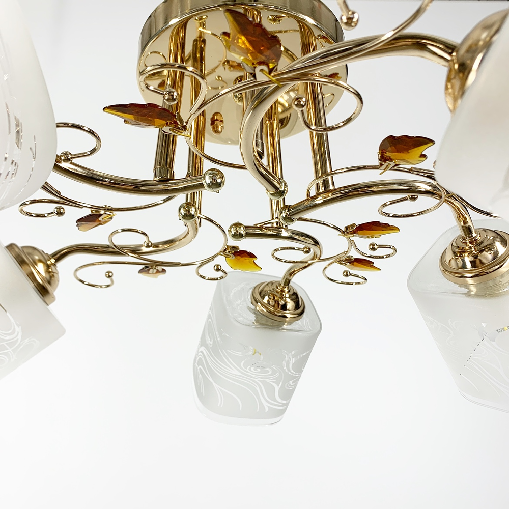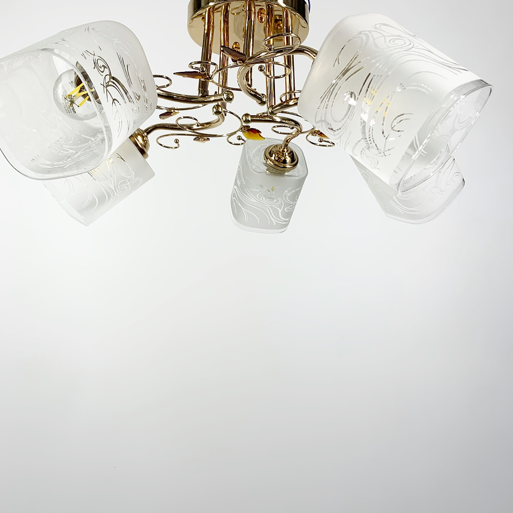 Стельова люстра на п'ять ламп зі скляними плафонами з візерунками. Найкраще використовувати у приміщенні із загальною площею 15 м. кв., при використанні лампочок 6 Вт (LED) або 60 Вт (стандартна).