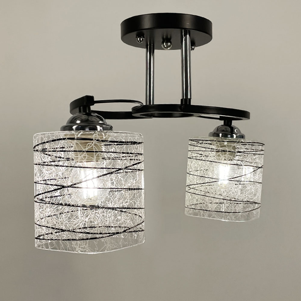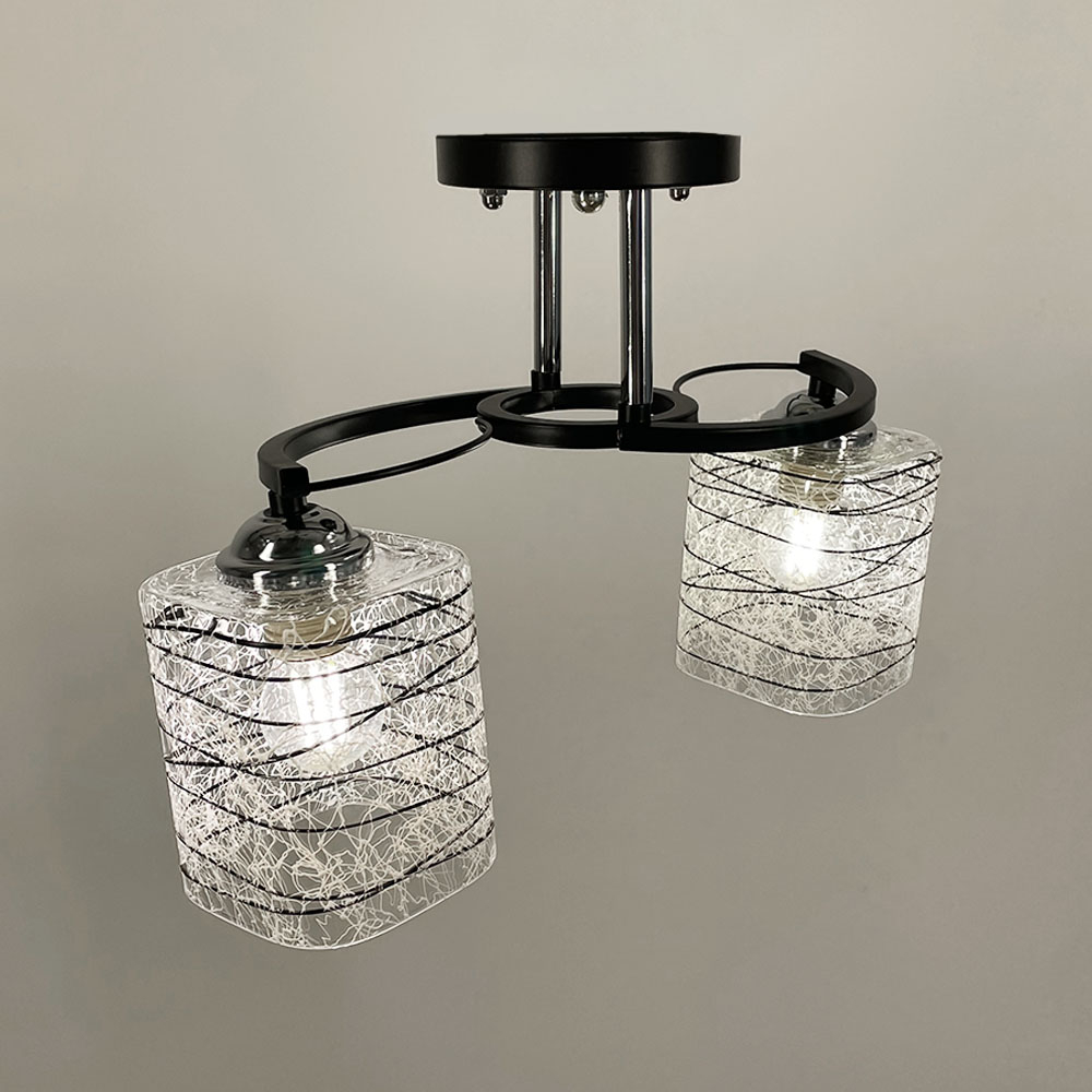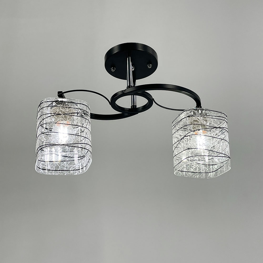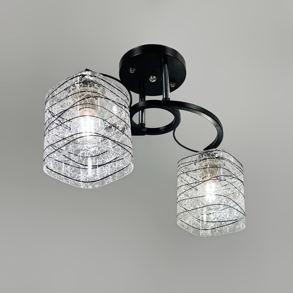 Стельова люстра в чорному металевому корпусі оснащена двома плафонами розміром 12х10 см. Плафон виготовлений з прозорого скла, прикрашеного стильними чорно-білими візерунками.
