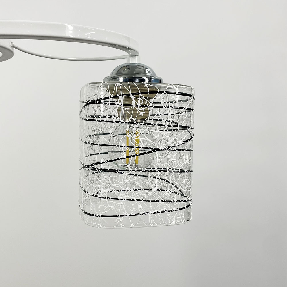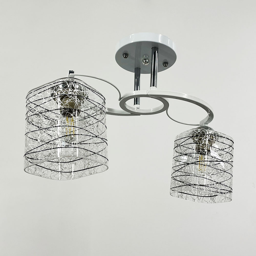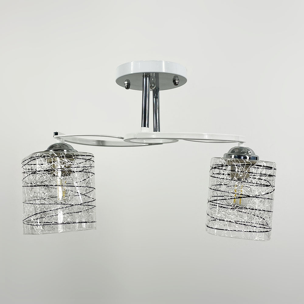 Стельова люстра в білому металевому корпусі оснащена двома плафонами розміром 12х10 см. Плафон виготовлений з прозорого скла, прикрашеного стильними чорно-білими візерунками.