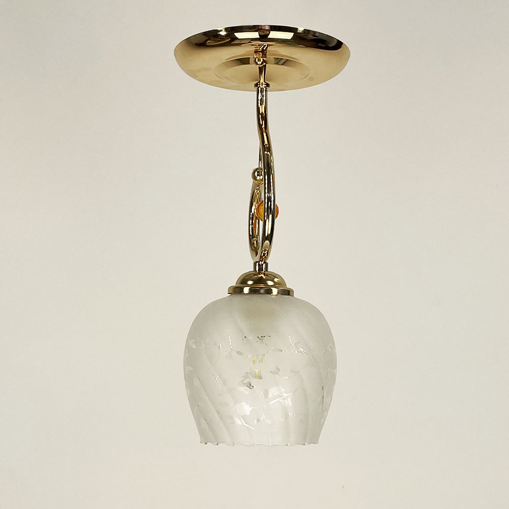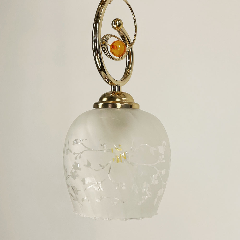Світильник у золотому металевому корпусі виконаний у флористичних мотивах. Скло матовий світильник плафон прикрашений квітковим візерунком. Діаметр плафона – 12 см. Загальна висота світильника – 32 см. Краще всього використовувати в приміщенні із загальною площею 3 м. кв.