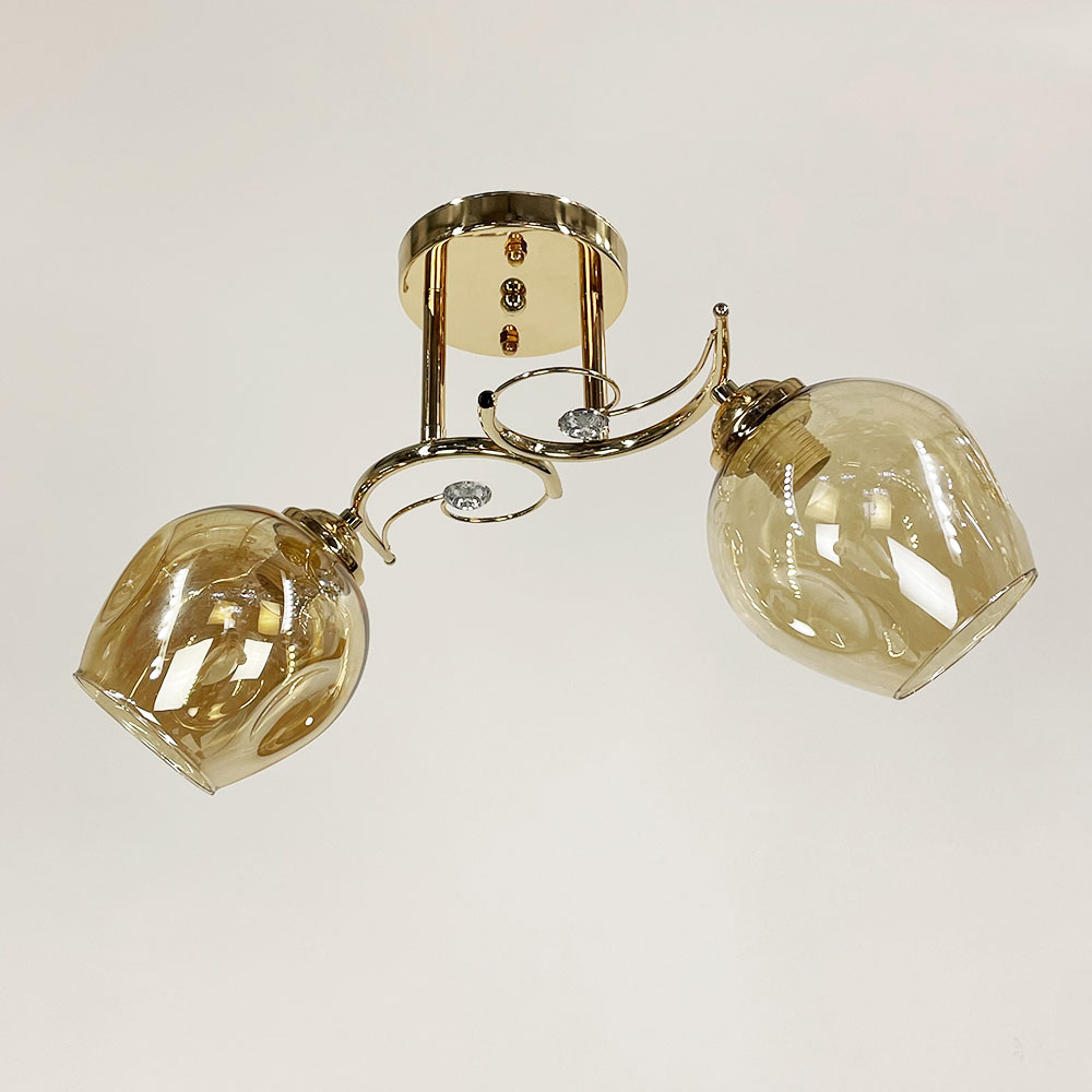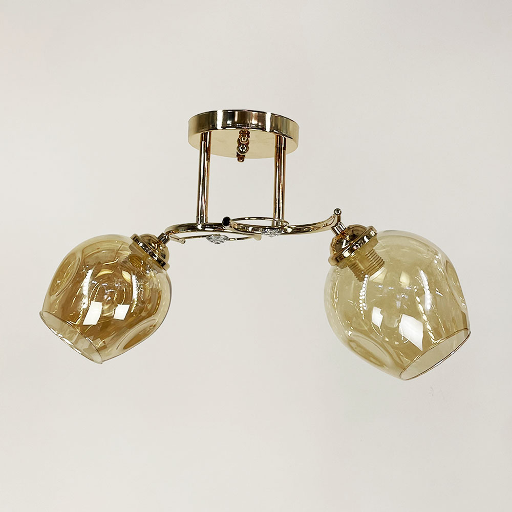 Стельова люстра в золотому металевому корпусі оснащена двома янтарними плафонами, кожен розміром 13х13 см. Плафони виготовлені зі скла, мають круглу форму. Елегантними акцентами на цій моделі є фурнітура із прозорого каміння.