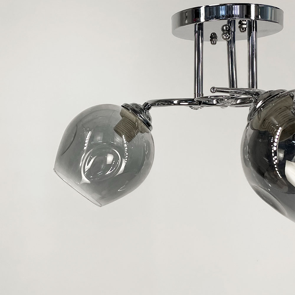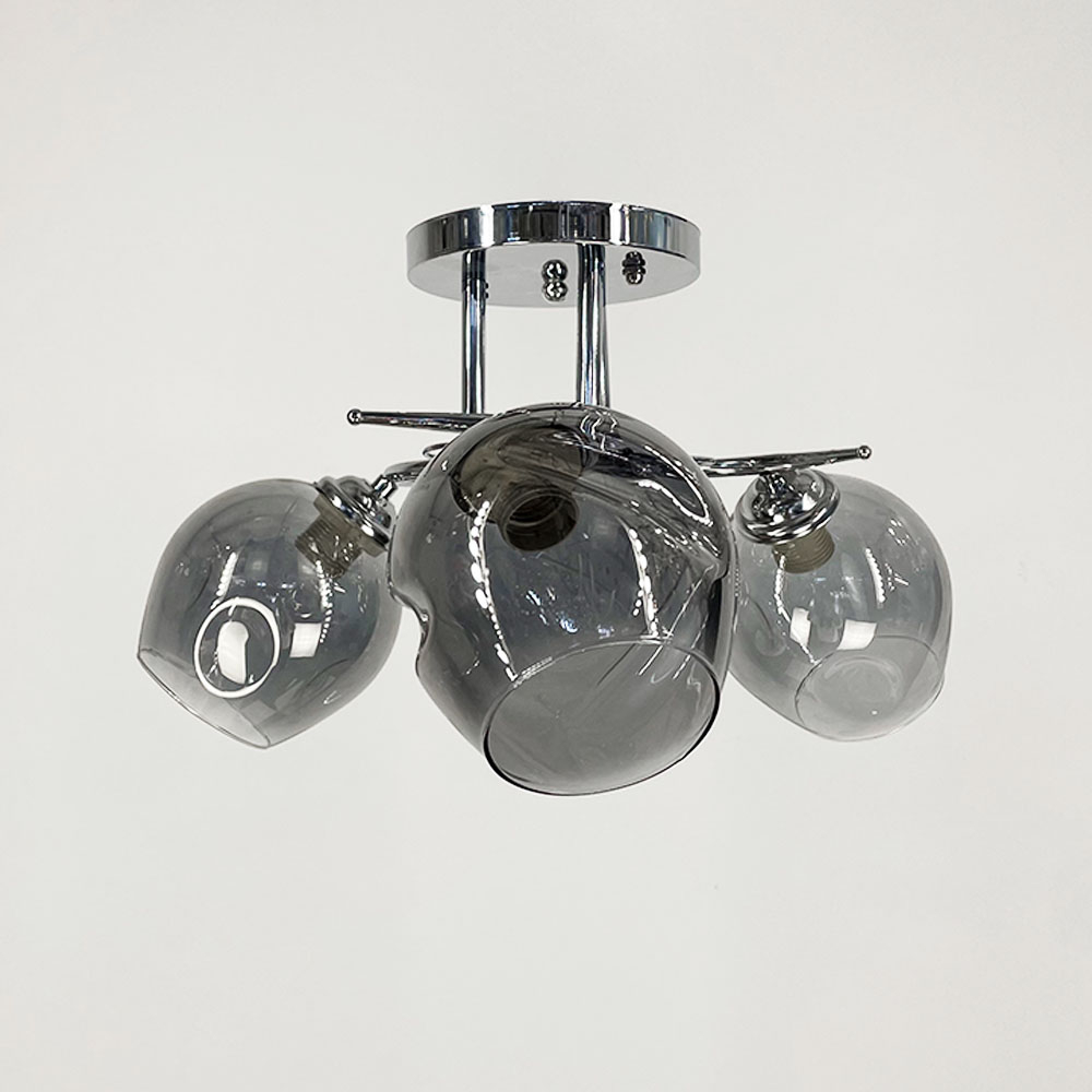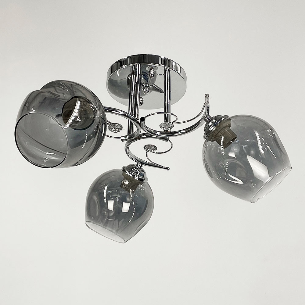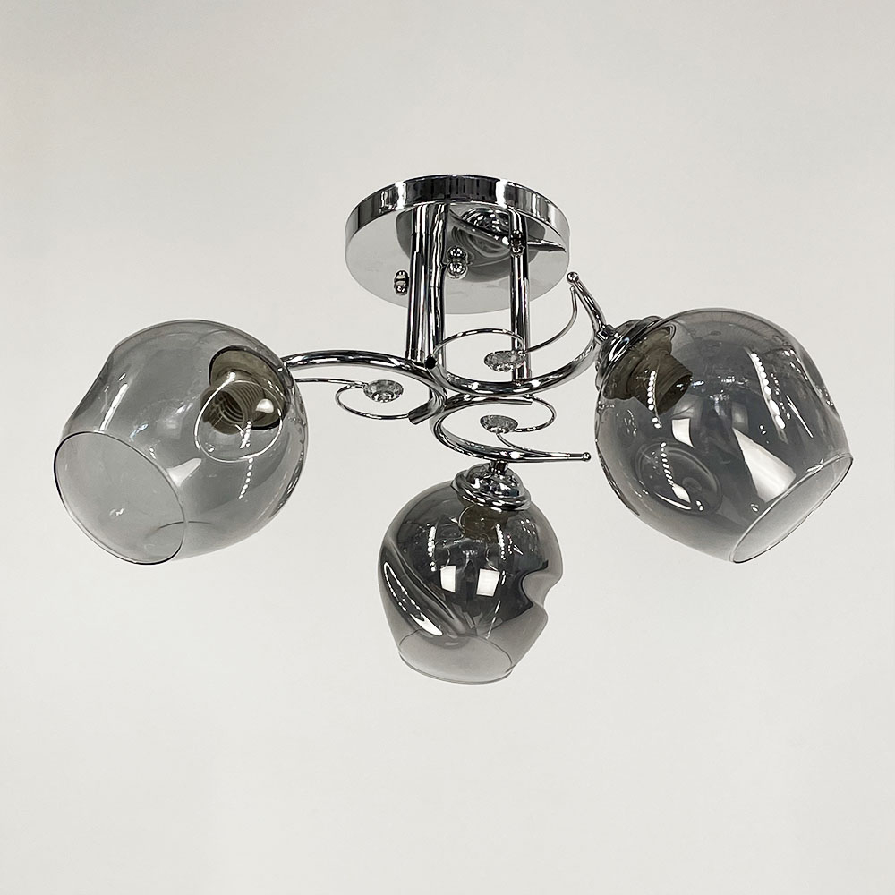 Стельова люстра в хромованому металевому корпусі оснащена трьома графітовими плафонами, кожен розміром 13х13 см. Плафони виготовлені зі скла, мають круглу форму. Елегантними акцентами на цій моделі є фурнітура із прозорого каміння.