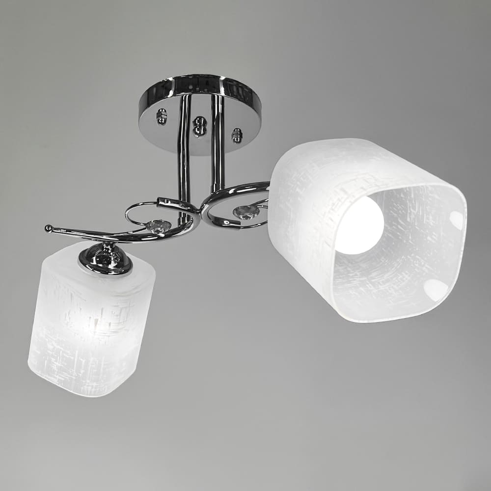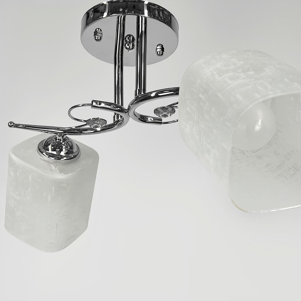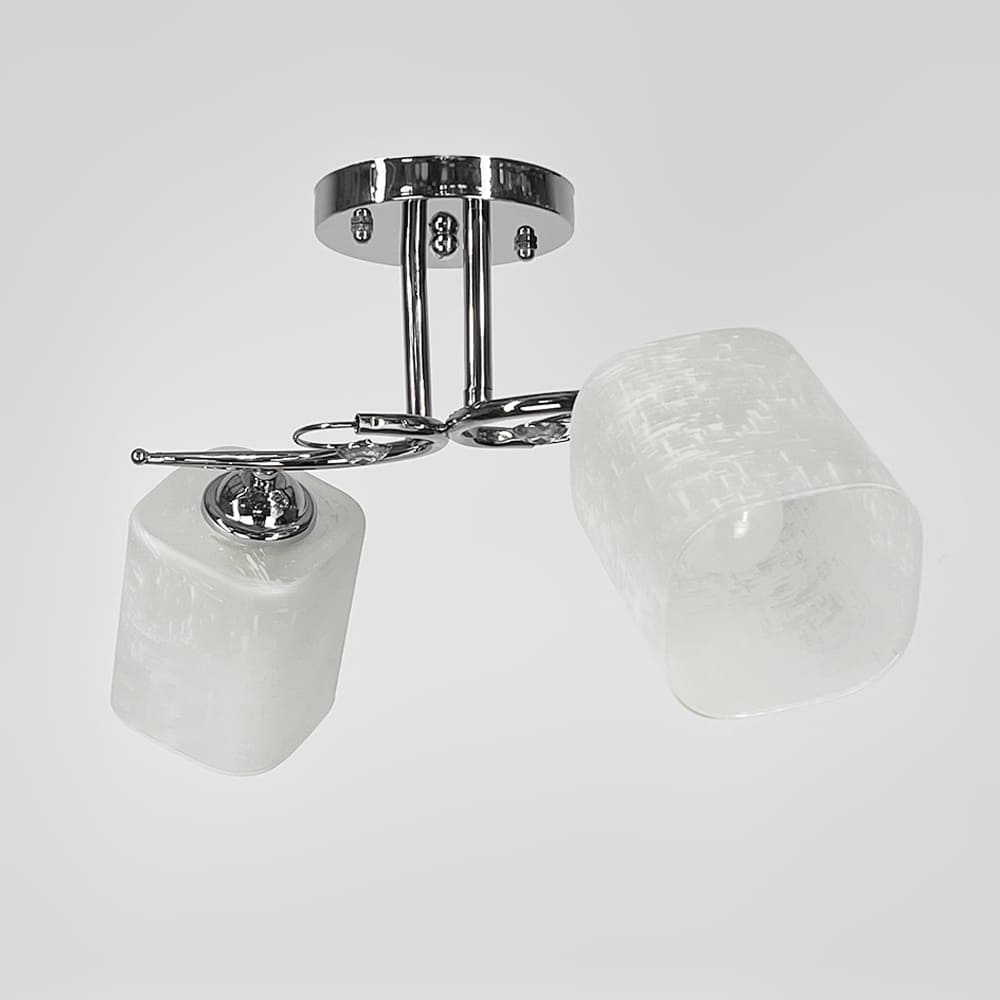 Стельова люстра на дві лампи з металевим корпусом кольору хром, оснащена двома плафонами. Плафони білого кольору з візерунком.