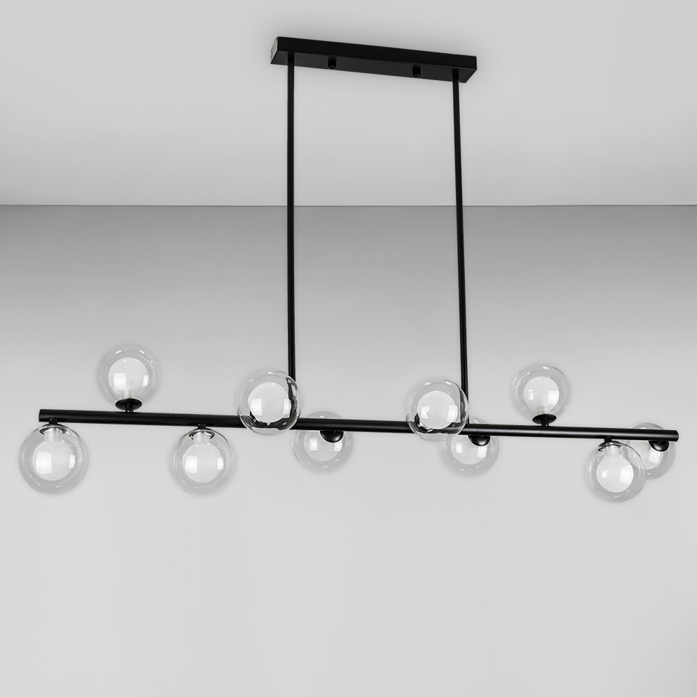 Декоративна стельова люстра на десять ламп у стилі Лофт зі скляними круглими плафонами на довгій планці.