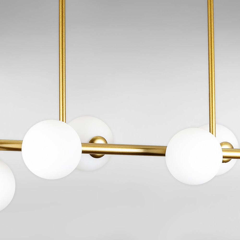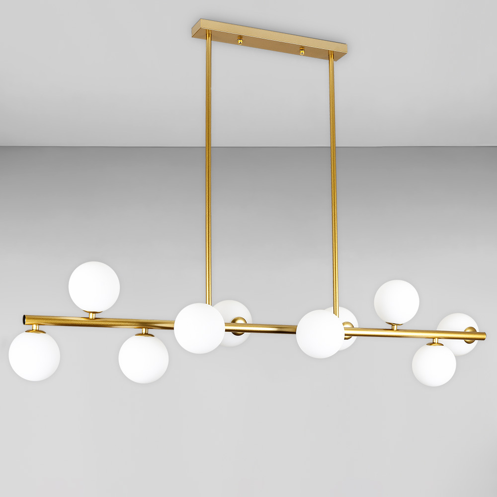 Декоративна стельова люстра на десять ламп у стилі Лофт зі скляними круглими плафонами на довгій планці.
