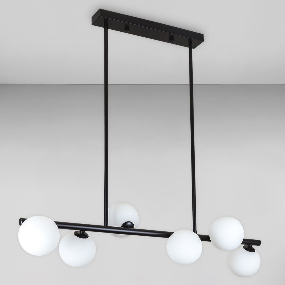 Декоративна стельова люстра на шість ламп у стилі Лофт зі скляними круглими плафонами на довгій планці.