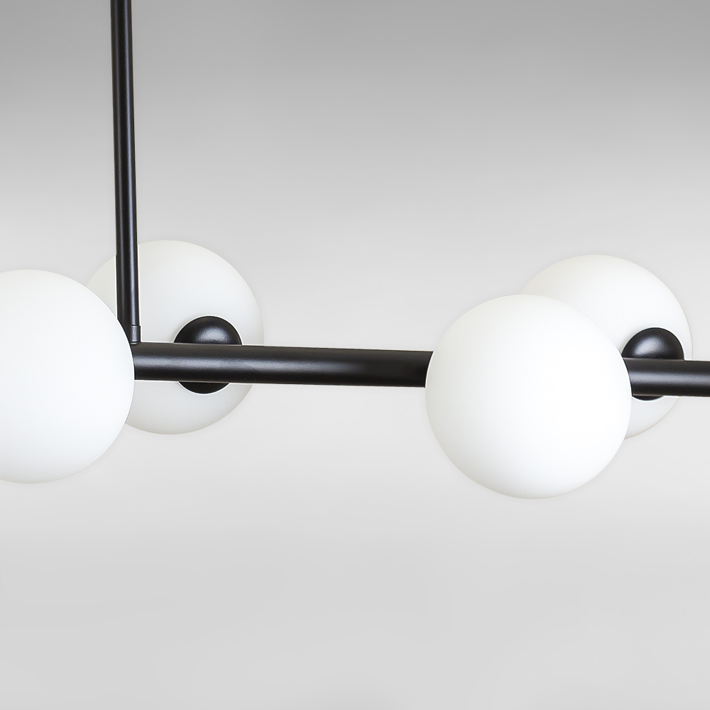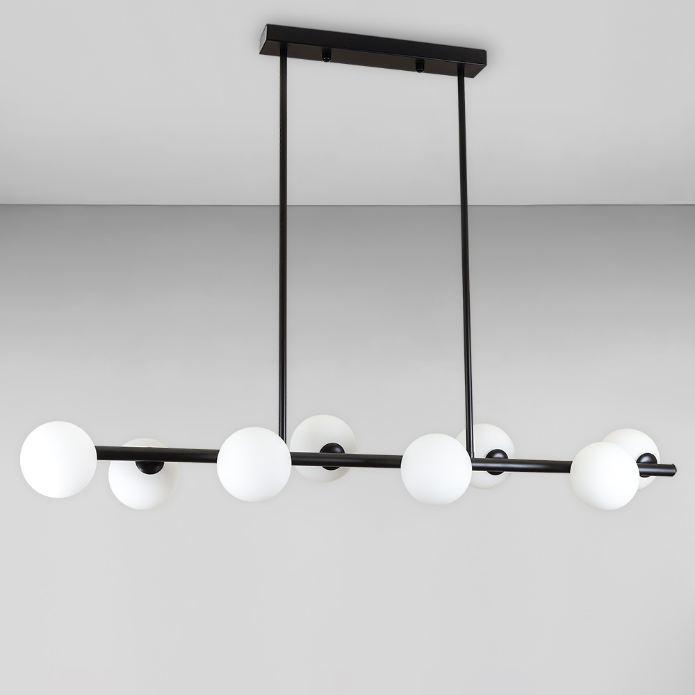Декоративна стельова люстра на вісім ламп у стилі Лофт зі скляними круглими плафонами на довгій планці.