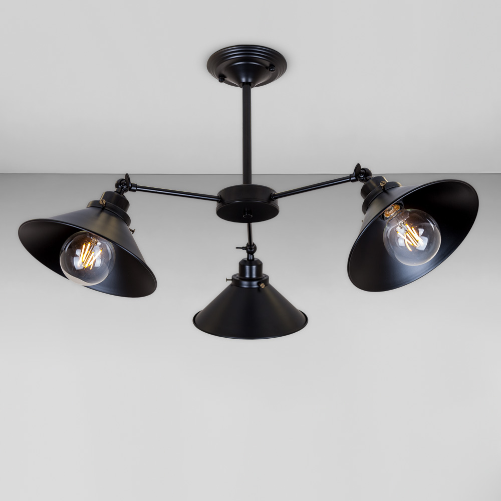 Стельова люстра на три металеві плафони з поворотним механізмом, які розсіюють світло рівномірно і створюють приємну атмосферу, має стильний і сучасний дизайн, що надає шарму та елегантності вашому простору. Вона підходить для різних інтер'єрів, чи то сучасний, класичний чи інший стиль.