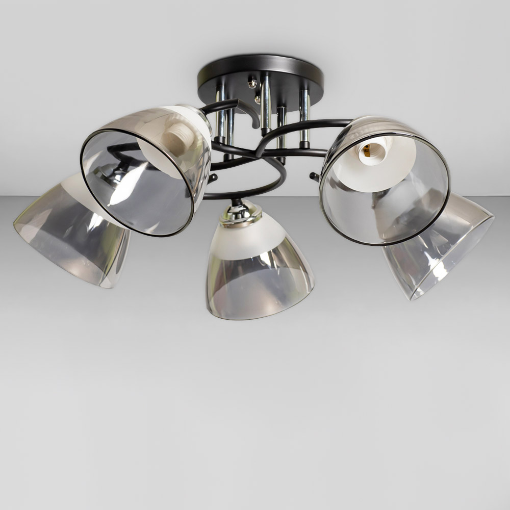 Стильна стельова люстра на п'ять ламп зі скляними плафонами конусної форми.