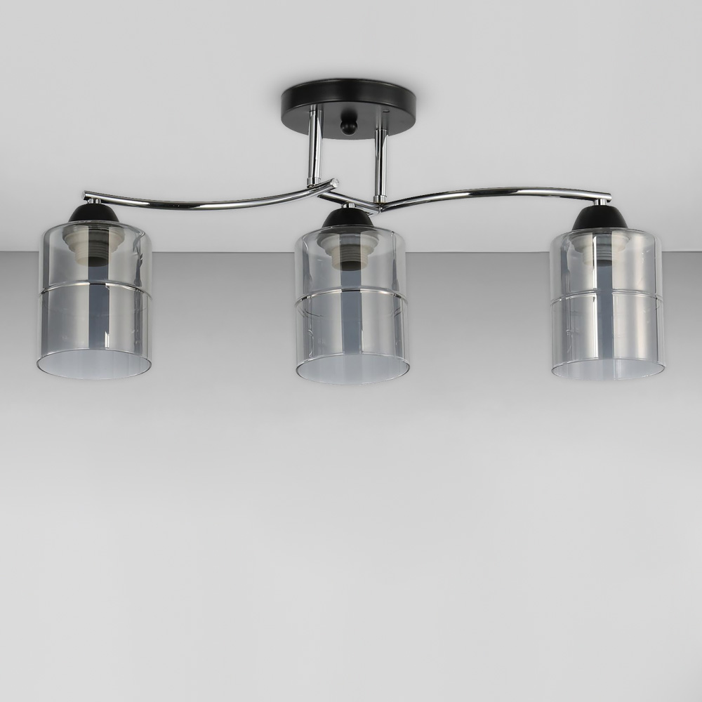 Стильна стельова люстра на три лампи зі скляними плафонами циліндричної форми.