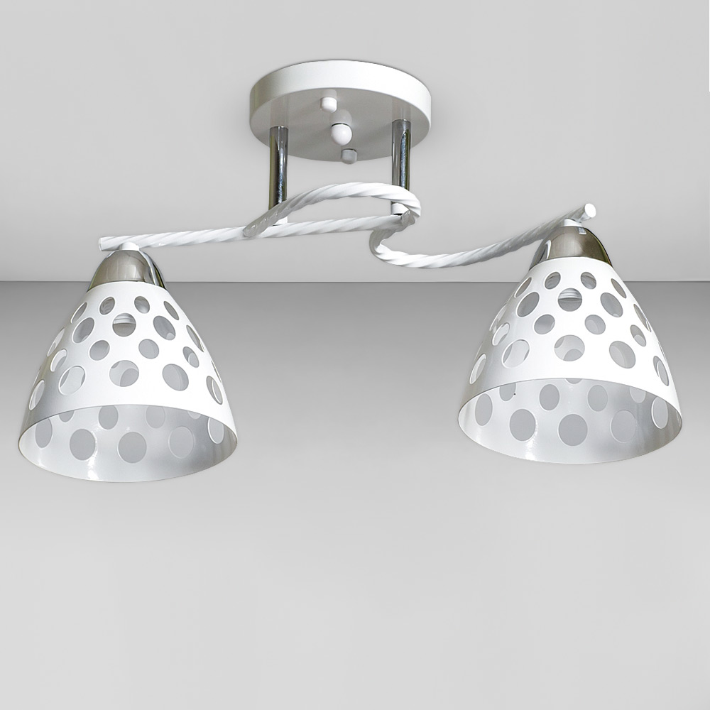 Стильна стельова люстра на дві лампи з металевими плафонами конусної форми з перфорацією.