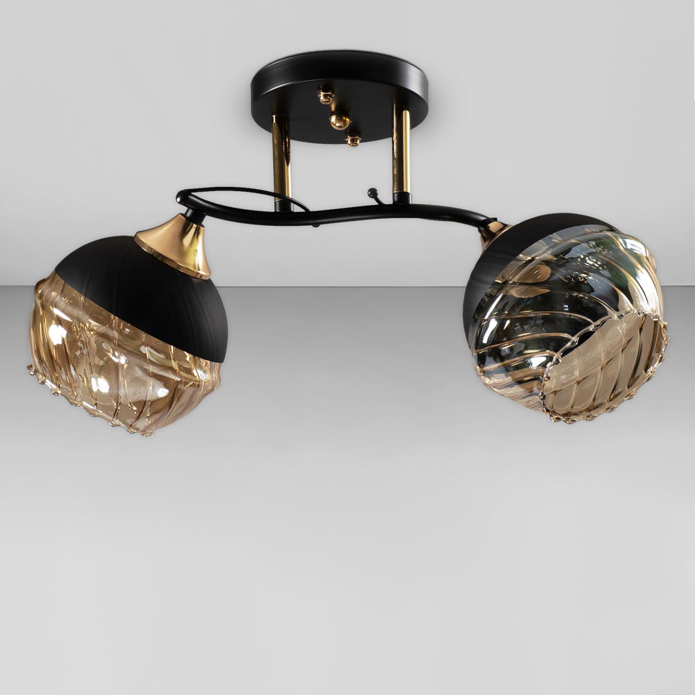 Стильна стельова люстра на дві лампи зі скляними декоративними плафонами круглої форми.