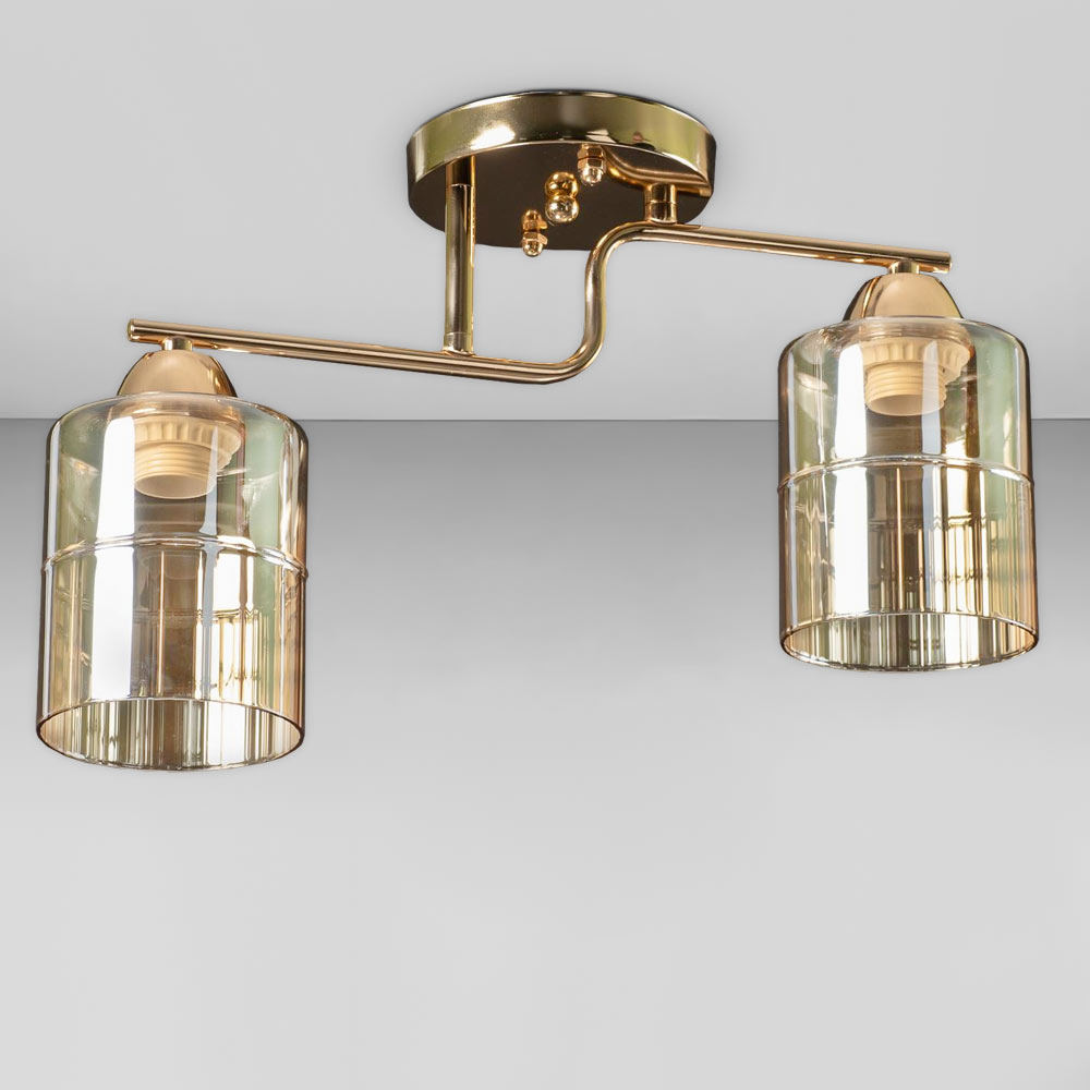 Стильна стельова люстра на дві лампи зі скляними декоративними плафонами циліндричної форми.