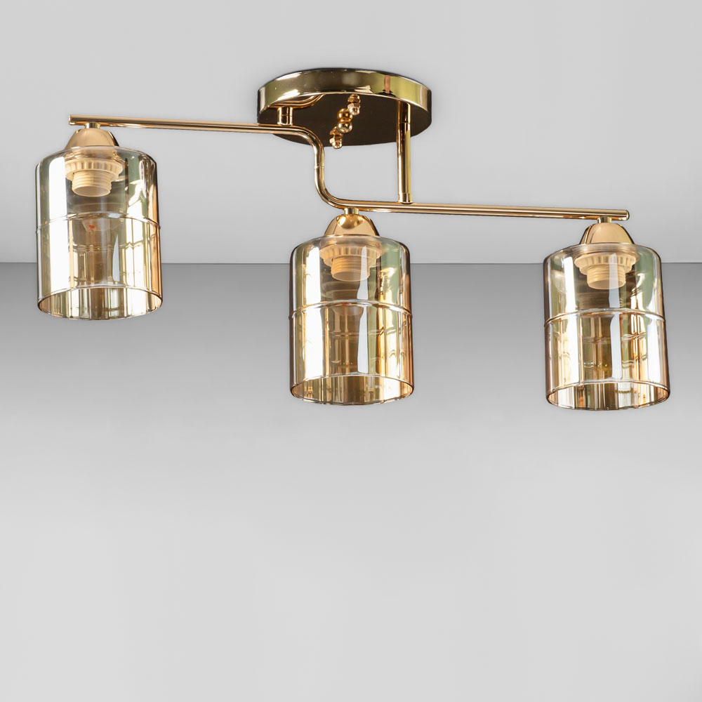 Стильна стельова люстра на три лампи зі скляними декоративними плафонами циліндричної форми.