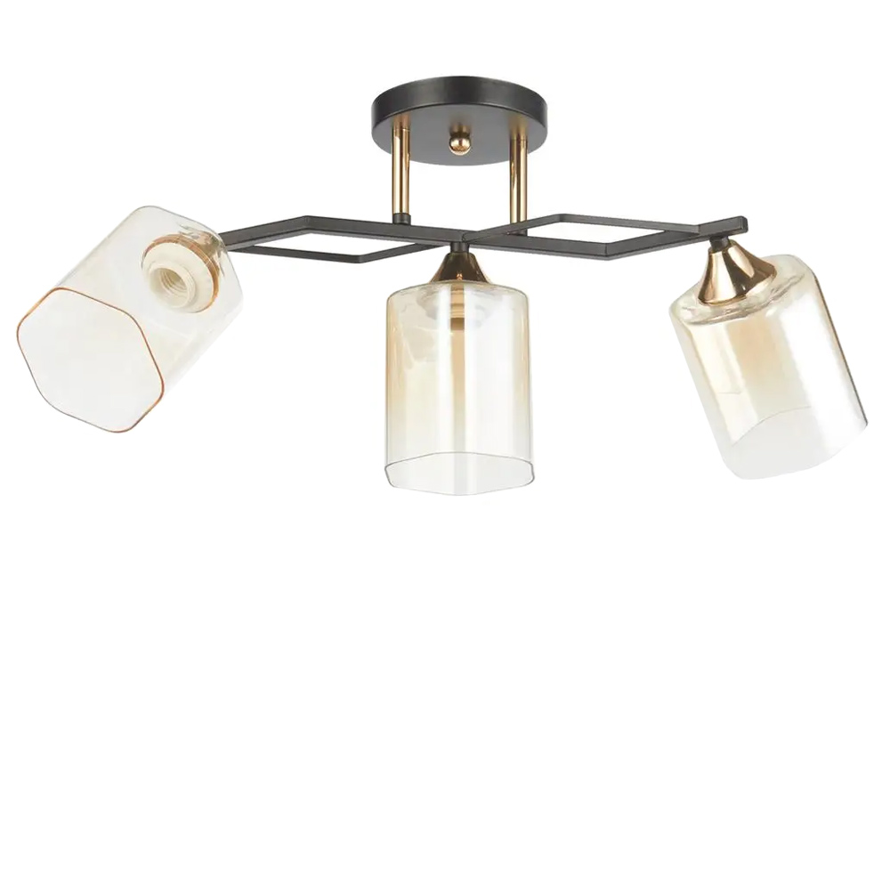 Стильна стельова люстра на три лампи зі скляними плафонами форми шестигранника.