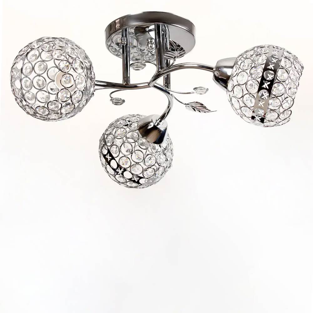 Стельова люстра на три лампи в сучасному стилі з круглими плафонами з металу з кришталевими вставками.