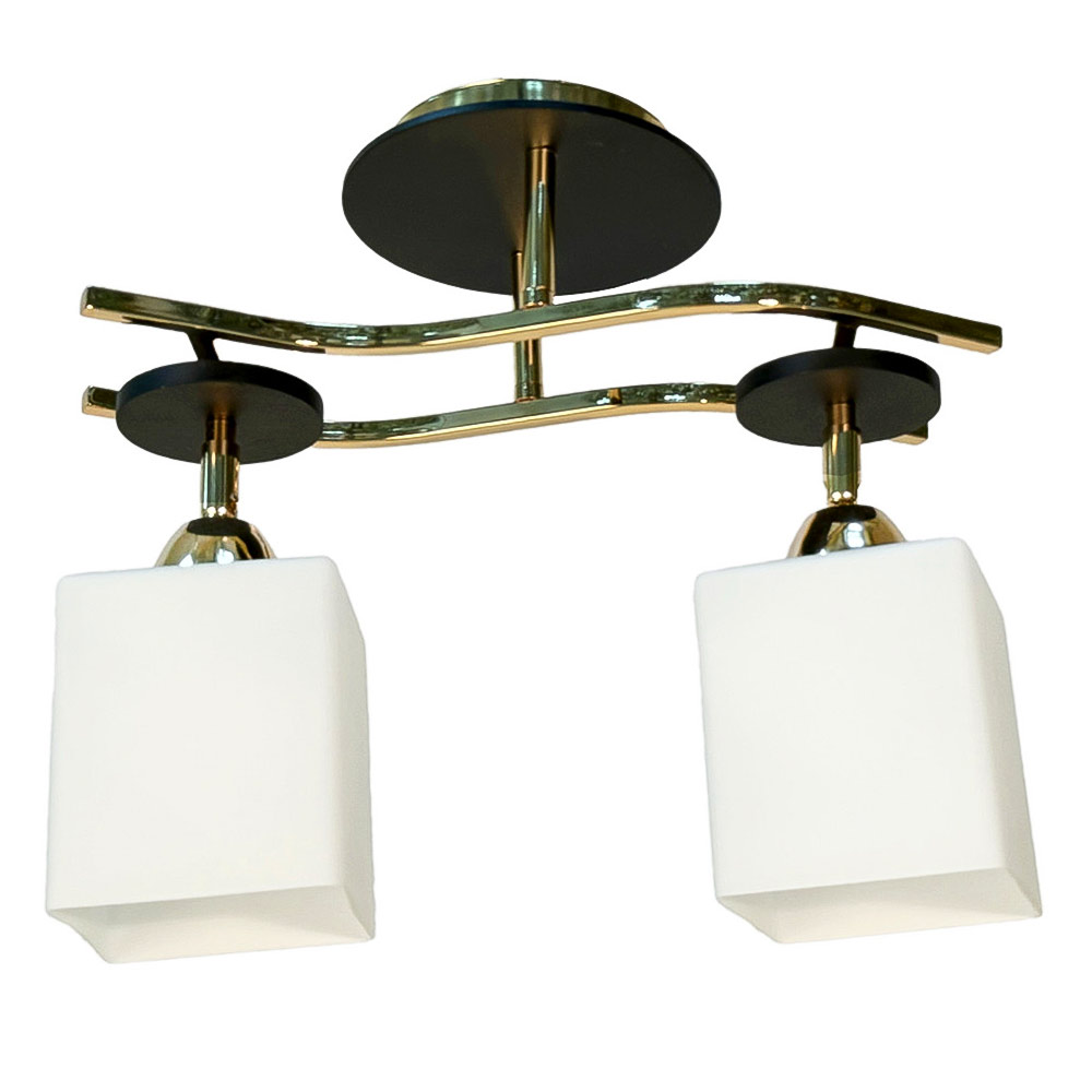 Люстра шириною 400 мм і висотою 300 мм, що робить її компактною і водночас досить виразною для використання у будь-яких приміщеннях. Каркас виготовлений із високоякісного металу золотого та чорного кольору, що надає люстрі сучасного та стильного вигляду. Два скляні плафони білого кольору створюють м'яке і рівномірне світло, яке зробить ваш інтер'єр ще затишним. Підтримує лампи із цоколем Е27 потужністю до 60 Вт, що дозволяє вибрати лампочки для вашого простору.