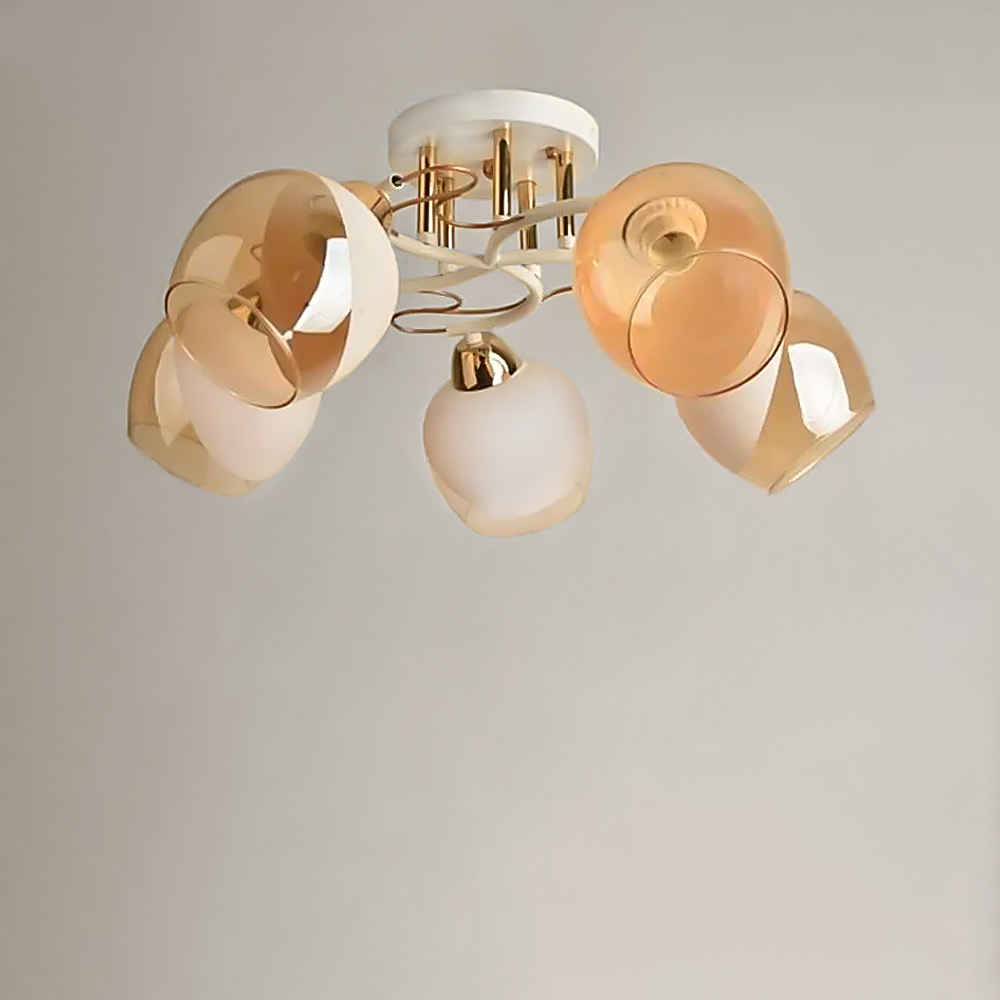 Стельова люстра на п'ять ламп зі скляними плафонами округлої форми, які розсіюють світло рівномірно і створюють приємну атмосферу, має стильний і сучасний дизайн, що надає шарму та елегантності вашому простору. Вона підходить для різних інтер'єрів, чи то сучасний, класичний чи інший стиль.