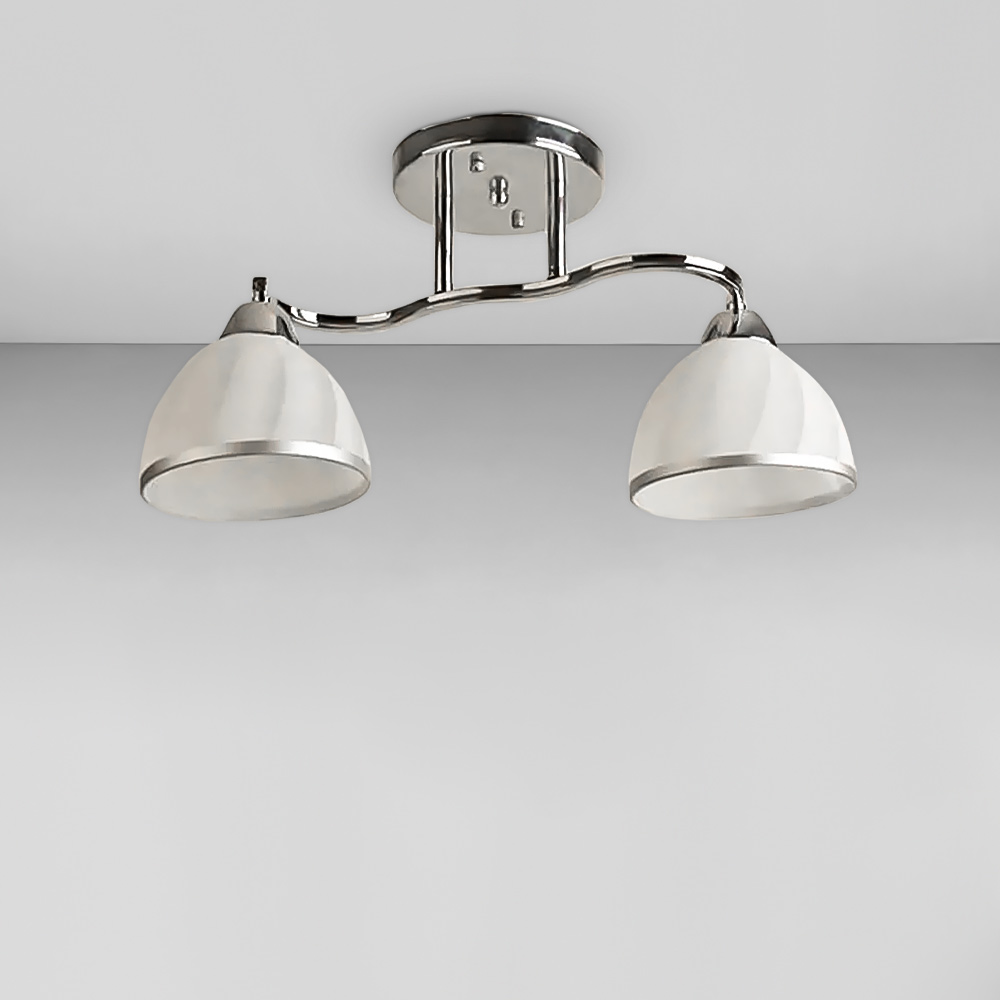 Стильна стельова люстра на дві лампи зі скляними плафонами конусної форми з облямівкою.
