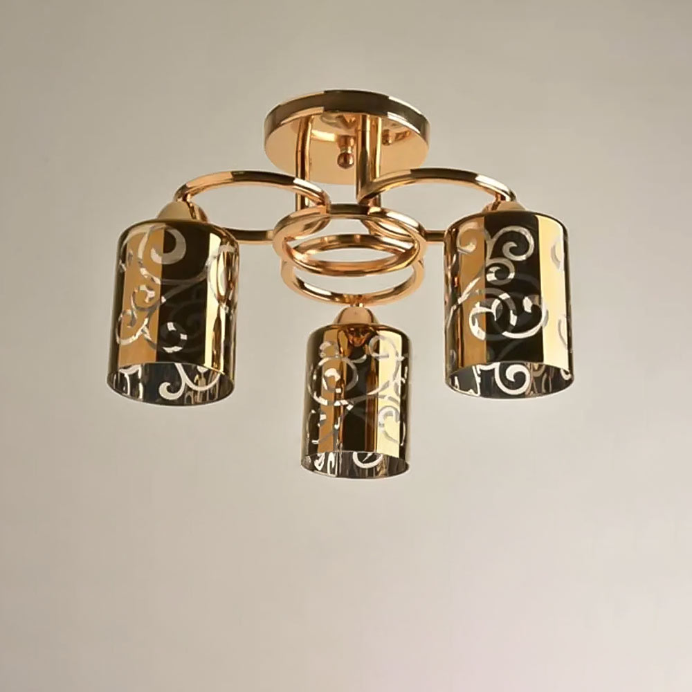 Стильна стельова люстра на три лампи зі скляними плафонами з візерунками.