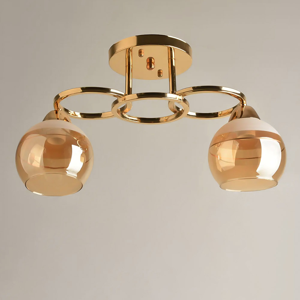 Стильна стельова люстра на дві лампи зі скляними плафонами круглої форми.