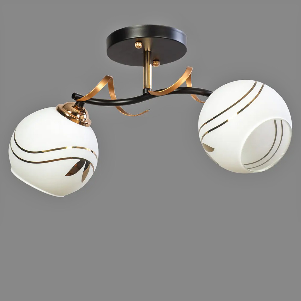 Стильна стельова люстра на дві лампи зі скляними плафонами круглої форми.