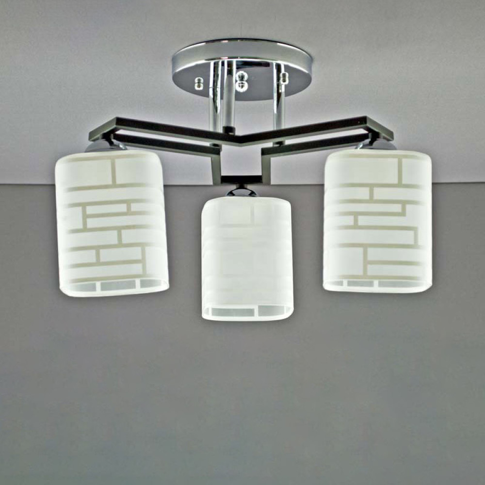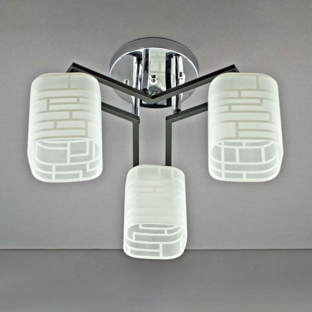 Стильна стельова люстра на три лампи зі скляними плафонами прямокутної форми.