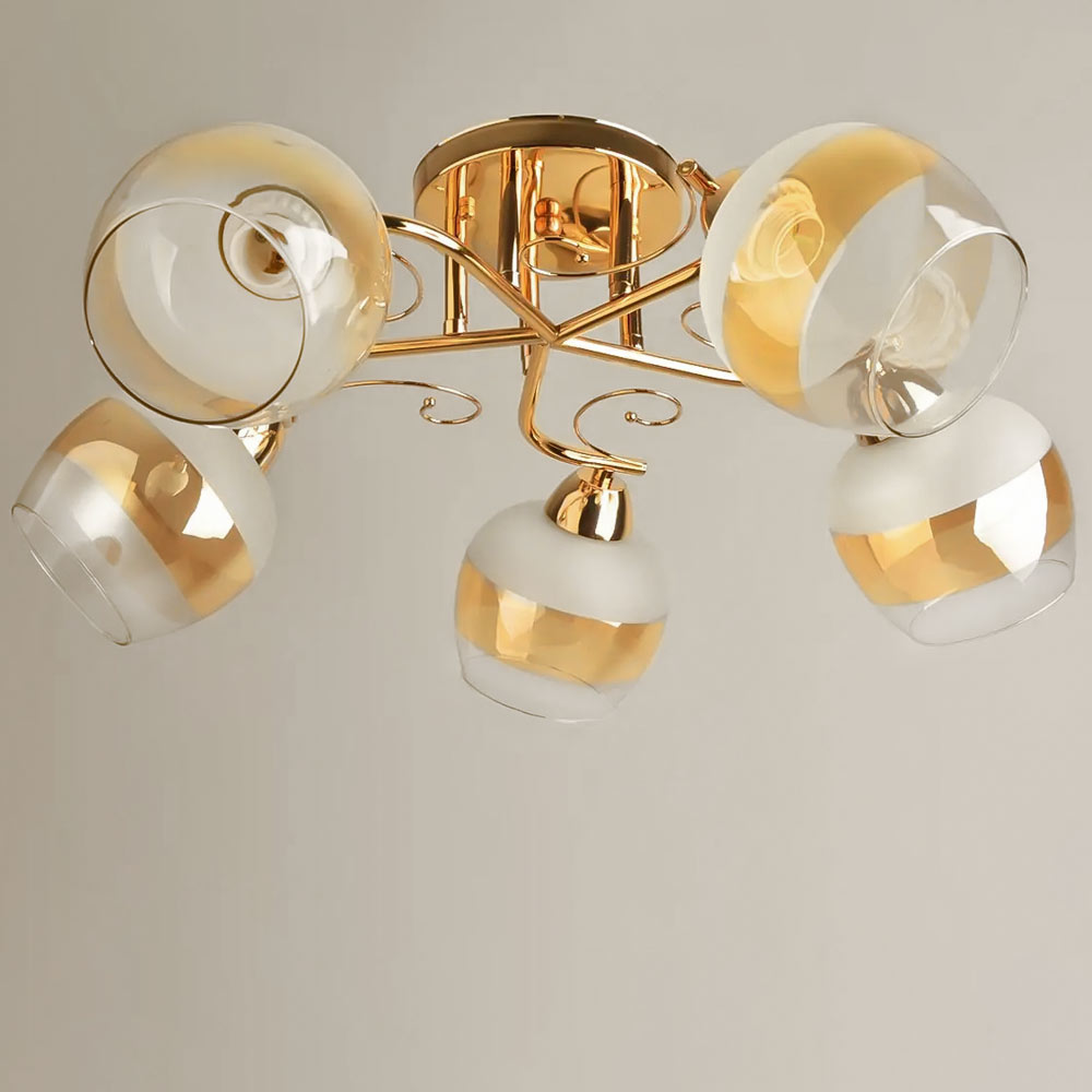 Стельова люстра в сучасному стилі на п'ять плафонів круглої форми, які розсіюють світло рівномірно і створюють приємну атмосферу, має стильний і сучасний дизайн, що надає шарму і елегантності вашому простору. Вона підходить для різних інтер'єрів, чи то сучасний, класичний чи інший стиль.