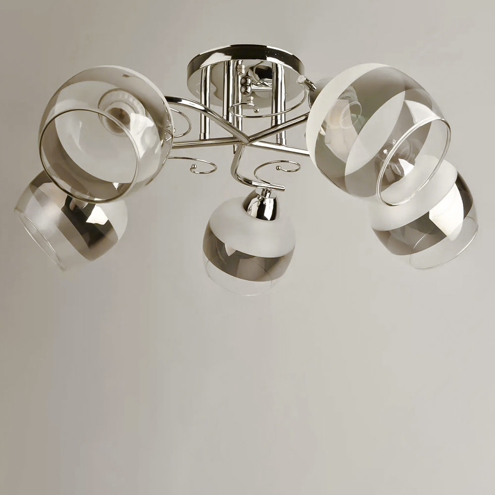 Стельова люстра в сучасному стилі на п'ять плафонів круглої форми, які розсіюють світло рівномірно і створюють приємну атмосферу, має стильний і сучасний дизайн, що надає шарму і елегантності вашому простору. Вона підходить для різних інтер'єрів, чи то сучасний, класичний чи інший стиль.