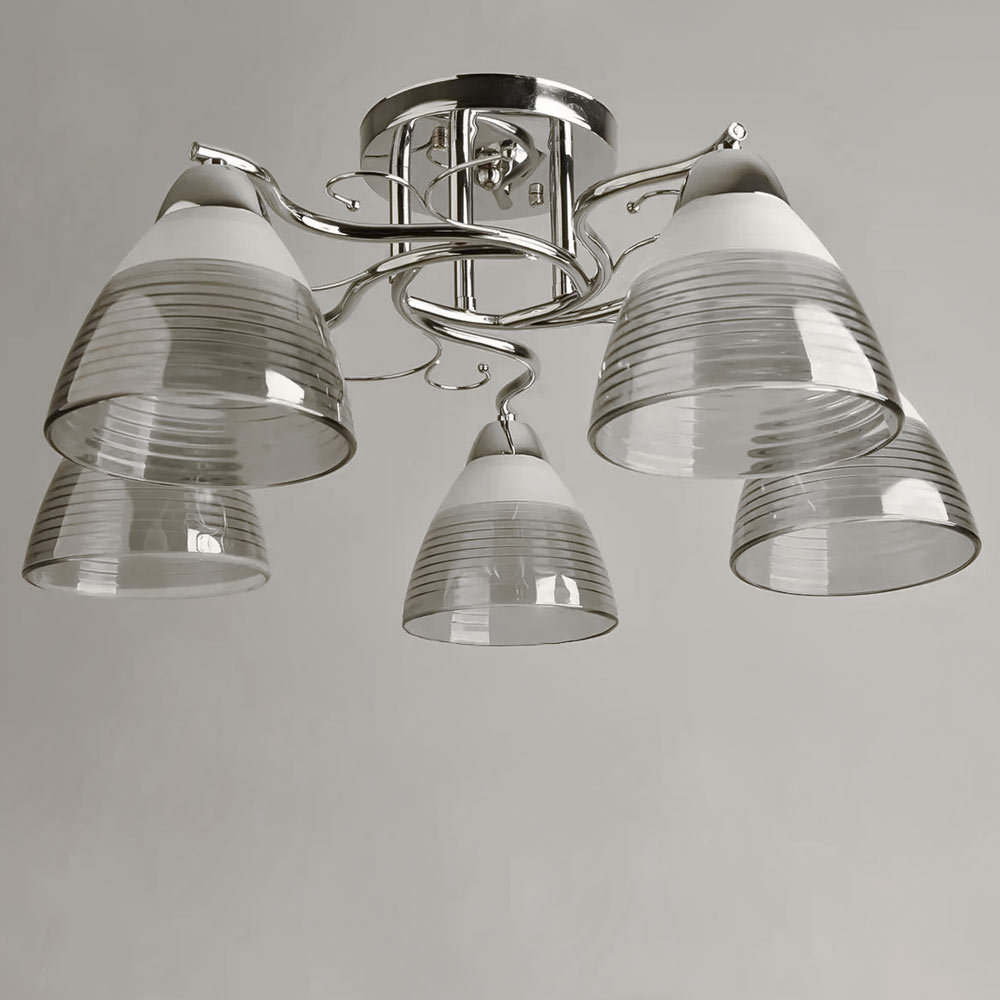Люстра стельова на п'ять плафонів конусної форми, які розсіюють світло рівномірно і створюють приємну атмосферу, має стильний та сучасний дизайн, що надає шарму та елегантності вашому простору. Вона підходить для різних інтер'єрів, чи то сучасний, класичний чи інший стиль.