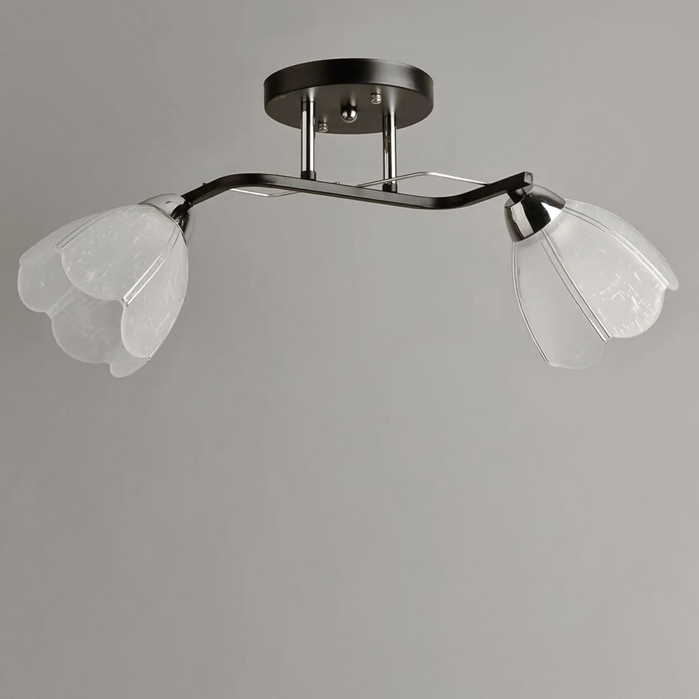 Стельова люстра в сучасному стилі на два плафони форми квітки які розсіюють світло рівномірно і створюють приємну атмосферу, має стильний і сучасний дизайн, що надає шарму і елегантності вашому простору. Вона підходить для різних інтер'єрів, чи то сучасний, класичний чи інший стиль.