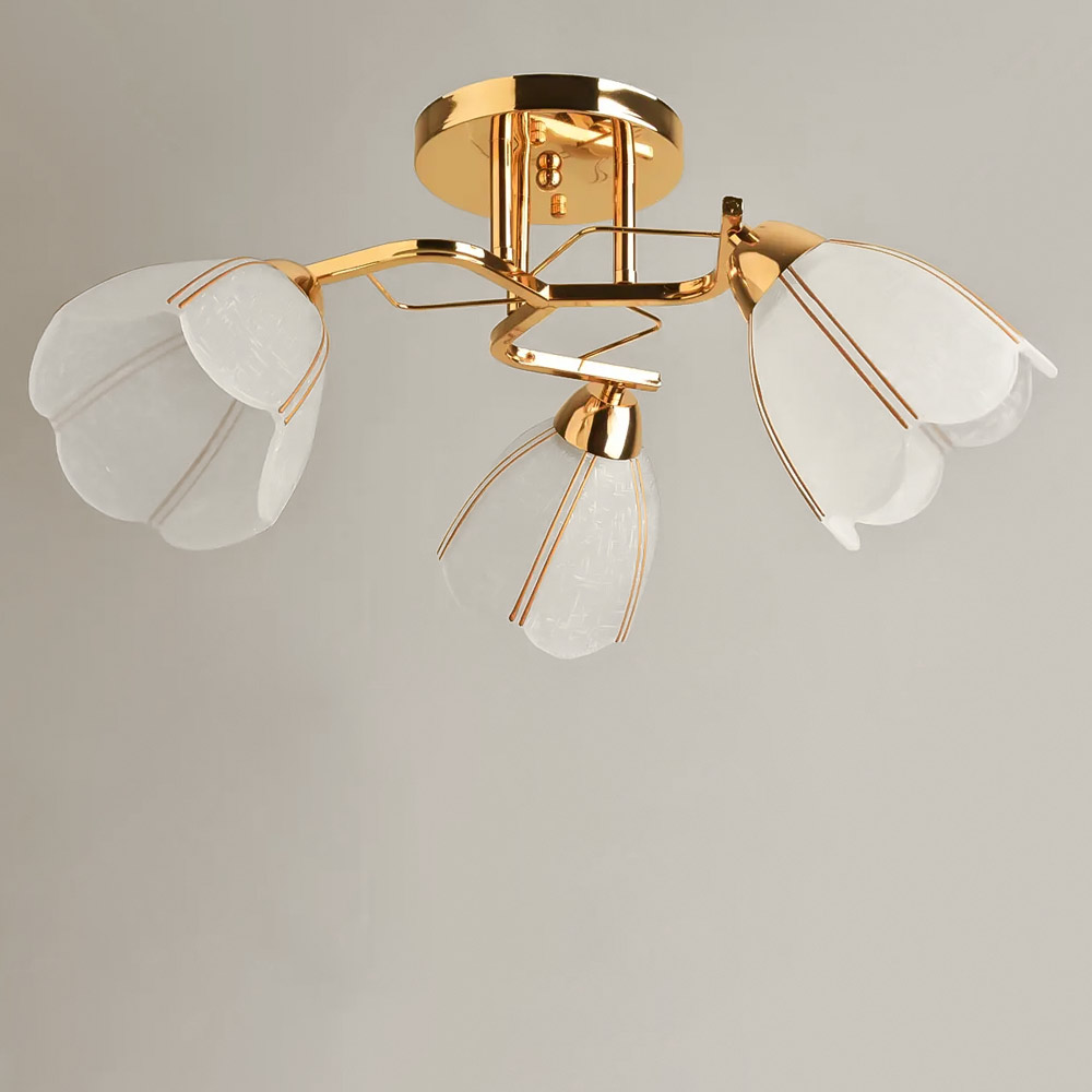 Стельова люстра в сучасному стилі на три плафони форми квітки які розсіюють світло рівномірно і створюють приємну атмосферу, має стильний і сучасний дизайн, що надає шарму і елегантності вашому простору. Вона підходить для різних інтер'єрів, чи то сучасний, класичний чи інший стиль.